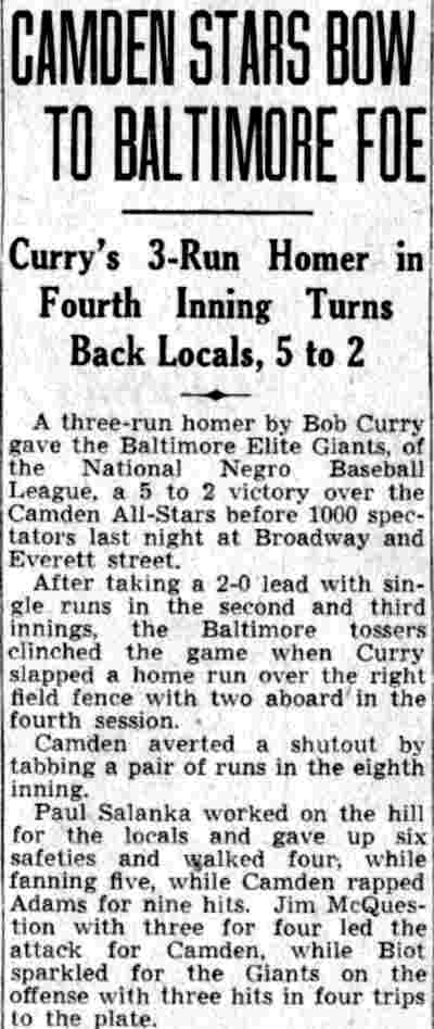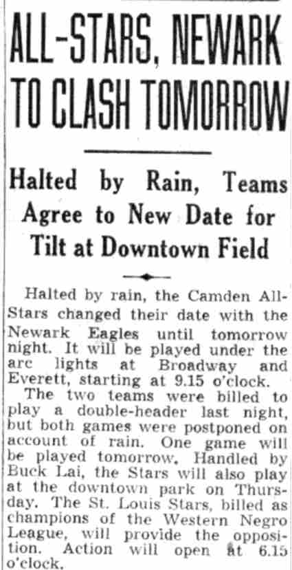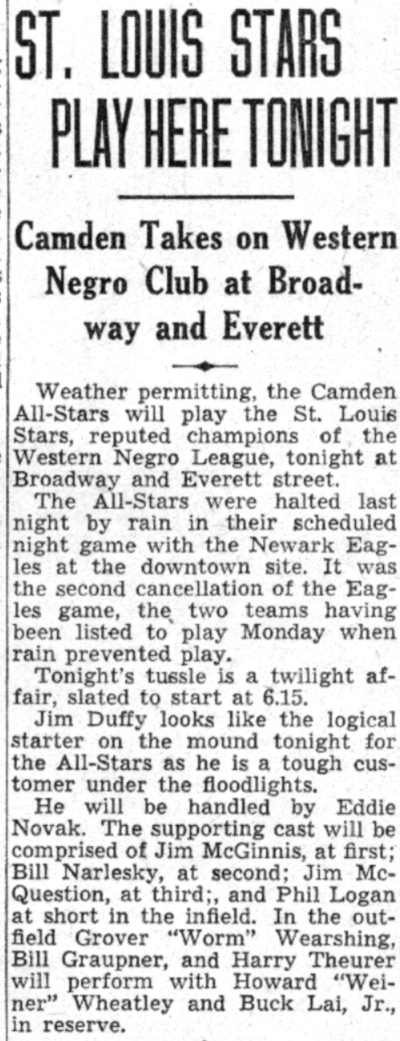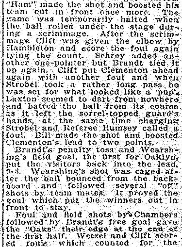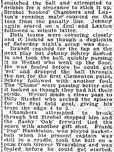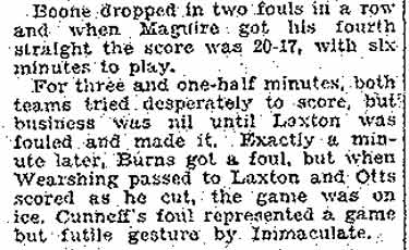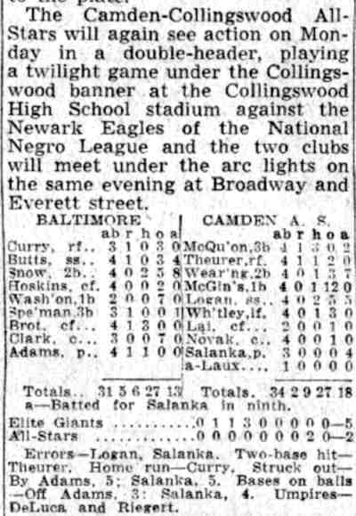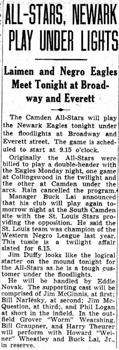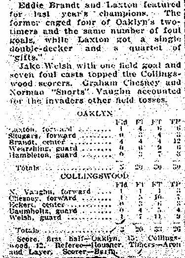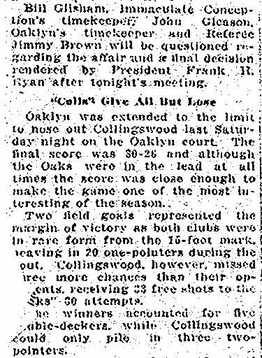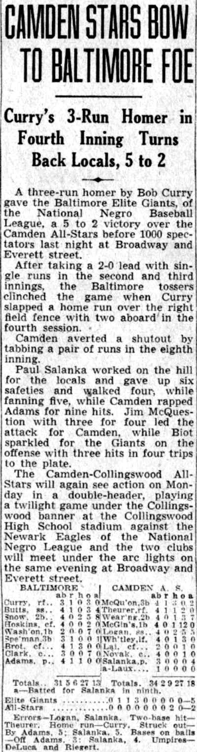 Central Camden beat the Camden Police quintet to make it two straight in the Municipal basketball circuit at Convention Hall last night. By blanking Clarence Phifer, and holding Ott Laxton down to six points the Central outfit spiked the Coppers’ attack. Clayton and Grover Wearshing did the heavy work for the winners. Clayton held Phifer without a field shot and tallied four times from the field. Wearshing bagged a trio of double-deckers. Gus Koerner was ejected from the game when Referee Keneman ruled him off the floor for abusive language. The Wayne dribblers battled down South Camden under a 46-20 score in the other combat Jimmy Reed and Devlin were the bright stars for the winners.