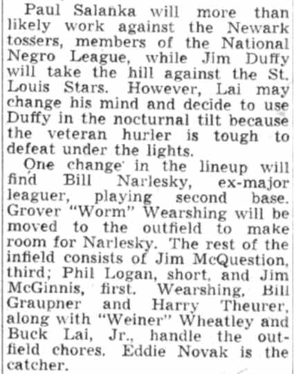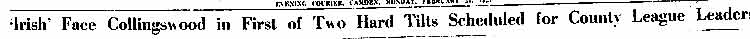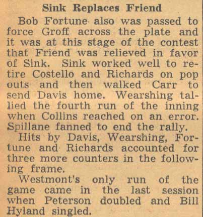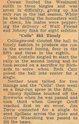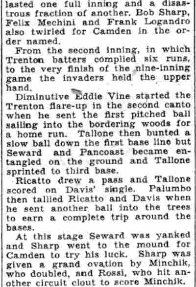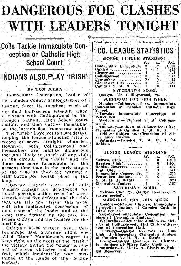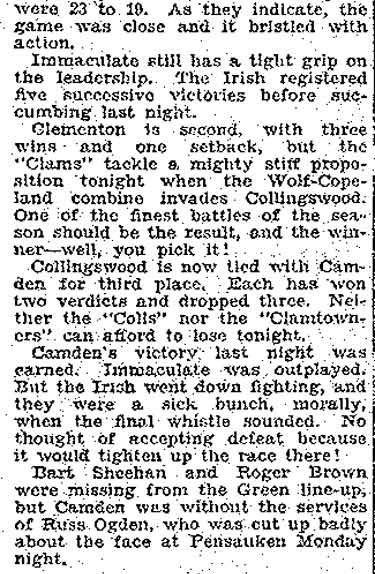 SLANTS JOE CREAN, Bud Sheehan, Sam Godfrey and Worm Wearshing all play in the Delaware River Basketball League … Joe Barry considers Walt Roman, a little chip, one of the best performers on his Catholic High quintet, and the coach recently had the diminutive guard showing the others on the varsity a few tricks … Haddon Heights High goes in for gymnastics in a big way and the school has all types of equipment … Norman Ford is the member of the faculty who teaches that sport … Joe Shields, former Camden High and Springfield College star, is attending Jefferson Medical College, .. Newt Danford, ex-Camden athlete, teaches at Westmont Junior High, and Ted Nitka, the Fordham Flash, is a faculty member at his alma mater, also Camden High … The senior William Denof is a swell bowler and the missus is a swell hostess … Johnny Vogeding and Jack Bitting, popular Woodbury athletes, are employed at the Mannington Mills plant in Salem … Frank Duffy is active in athletics at the RCA here. |