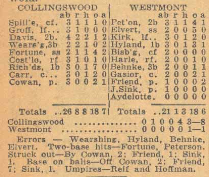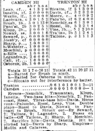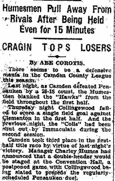 Touchdowns- Wearshing 2, Wallace, Gricco, Winners, Shuster. Points after touchdowns, Wearshing 3, Wise 1 (placement) Substitutions- Camden: Malmsbury for Wearshing, Lawrence for Jackson, Wallace for Carson, Winners for White, Wearshing for Malmsbury, Mozeleski for Gricco, Wisniewski for Weber, Gassel for Cylinder, Tommesetti for Purnell, White for Wallace, Smith for White, Egbert for Jackson. Collingswood: Boggs for Wise, Pickens for Moran, Moran for Voight, Fortiner for Shuster, Wise for Boggs, Galbraith for Hood, Young for Webb. Referees-Geiges, Swarthmore. Umpire- Tatnall, Haverford. Head linesman- Weller, Temple. |