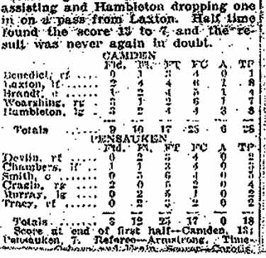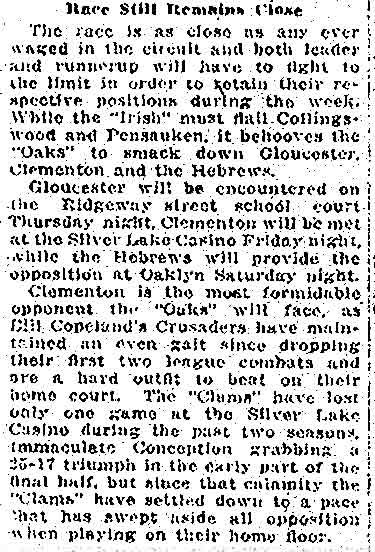 Second-half competition in the Reesman basketball league will begin tonight with a twin bill at Convention Hall. Thirteenth Ward, which holds the edge in the yet unfinished first-half race, meets the formidable Camden Police quintet. Wayne and Ninth Wail meet in the other tussle. Two new clubs have joined the league, for the second-half title hunt. Charley Humes, manager of the Camden Community Club in the County League, will pilot his First Ward club in the municipal loop during the final semester while further interest is assured with the addition of the Central Camden aggregation. These clubs are keen rivals and both boast of strong rosters. It is understood that Humes will file the names of several players who saw service in the county circuit as members of his old First Ward outfit while others who played with that team are also listed with Central Camden. Albert ‘Reds' Malloie is boss of the Central outfit and has signed up a classy collection of cagers for this type of play. Grover "Worm" Wearshing, who led Central Camden to the Reesman baseball championship last season, and who is regarded as one of the best backfield performers in this vicinity, is one of the Malloie entrants. Sam Godfrey. A teammate with Wearshing at Temple University, Johnny Chambers, Clayton Phifer, Lucky Mezger, Johnny Morrissey, Tom Tracy, and Ross “Bunny” Blood complete the cast with Malloie. At the last meeting of the league managers it was decided to reduce the salaries of referees from $5.00 to $3.50 for each night’s work. Officials in the past have handled two games and the same stipulation is required for the lower fee in the second half or the schedule. All eight of the first half combatants are planning to strengthen their rosters far the final drive. South Camden, Haddon A.A. Radio A.A., St. Paul, Ninth Ward. Camden Police, Wayne, and Fifth Ward are the contenders. The first contest tonight is timed to start at 8:00. |