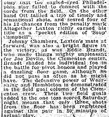STEVE O'KEEFE Grover Wearshing, whose football feats and dazzling play on the basketball boards, form a glowing part of the athletic history of Camden High School and Temple University, has enlisted with the Camden Club in the Eastern League and will join the team when the inaugural skirmish with the Kennett Square (Pa.) quintet is staged at the Convention Hall annex tonight. Wearshing, now gridiron mentor at Camden High, will thus don the royal blue and white with another court hero who sparkled for the purple and gold. Eddie Lobley, captain of the Penn passers last season already has signed to perform along with Phil Knudsen, Bill Bergen, Tony Ca1land, Bill Johnson and Bernie Maguire the remainder of the local roster. Owing to the heavy demand for seats, Manager Brown feels that a capacity crowd will met the club. Announcement of the signing of wearshing was made last night by Manager Jimmy Brown who expressed confidence that the present lineup will prove capable of hanging up a victory over Joe Sheehan and his invading mates tonight. Whether wearshing will start is not determined but it is high1y probable that he will at some time during the fray pair off in the backfield with the rugged Bergen, who proved a popular member of the local cast last season. Johnson in Backfield Bergen's running mate when the game starts will probably be Johnson, who combines the happy faculty of speedy defensive play and. a deadly aim for the baskets. Lobley will get the call for one of the forward berths with the sturdy little Calland or Maguire in the opposite corner. Knudsen, who abandoned the American: League position with the Paterson club, is regarded as one of the foremost pivot men in the East and his husky, six-foot-four-inch frame should prove valuable in mid-floor combat. Owing to the fact that Knudsen, Bergen, Calland and Johnson have been playing regularly with the Union City Reds for the past several weeks, it is likely that Manager Brown will send this quartet into action with Lobley at the start of the game. Johnson, however, may be shifted to a forward post alongside Lobley in the even Wearshing is summoned to open the battle in the backfield. Sheehan and Scrone at Guards The Kennett Square ensemble will show Joe Sheehan, one-time Camden Catholic High and Villanova College guard, paired with Joe Scrone, a former local dribbler, in the defensive department with "Red" Ellis and Walter Gailey at forwards. Charley "Dink" Irwin is slated to engage Knudsen in the jumping duel. Fans who flock to the civic hall for the fray will see a change in the battle floor, as the court has been shifted to the center of the annex and space for several hundred additional seats provided. In addition to this, music for dancing during the intermission and following the game will be provided. The preliminary tussle tonight will present Sam Price and his Peerless Kids in action with the R. M. Hollingshead passers. This game will mark the start of the Camden County Industrial League pennant scramble. The early game is timed to start promptly at 8 p. m., under a penalty for failure to do so, in order that the Eastern League teams may be permitted to take the floor at 9 o'clock. |