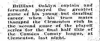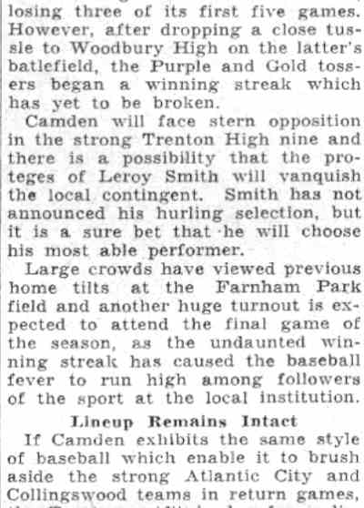 School. Lobley, who was a three-letterman at camden high, graduated from the university of pennsylvania and was on the varsity basketball team for three successive years, captaining the five in his senior year when the red and blue won the eastern intercollegiate championship. O'Brien, who was a star center at camden high on the eleven, is a graduate of St. Joseph's College, and performed for three years at that position for the Philadelphia institution. While both have been assigned as teachers, it is likely that they will build up a foundation of grammar school athletics, teaching the youngsters the fundamentals of various sports. Fulton also announced last night that in dividing the present enrollment at camden high into two separate institutions, that both will have the required number of male students to enter the Group 4 division in athletics. Schedules are already being drawn up for football for teams at both the academic and commercial arts schools. Fulton also stated that in all likelihood the elevens of both schools will meet on Thanksgiving Day to decide the supremacy of the city public school football title. However, this cannot be decided upon definitely until the alumni agrees to abandon their regular Thanksgiving Day game with the senior high team. . |