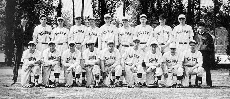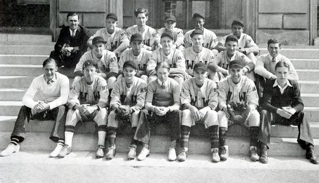 championship. With seven letter men back from last year, coach "Worm" Wearshing has high hopes of putting out another winning ball club. The veterans are Norm Selby, a hard hitting right fielder, John Timmons, a chucker with plenty of zip on the ball; Harry King. a fleet-footed outfielder; Harry Fox, a stellar all-around player, who covers the outer gardens; Merrill Long. our keystone sacker; Joe Gaughan, a flinger; and Bob Bieler, who will handle the catching duties like a veteran.. Other prospects are "Ripper" Holt, who will cover the initial sack; Ben Fillari, our indomitable third baseman, and Tom Glennon, the shortstop. Warren Jones, John Kreps, Ben Zippke, Joe Gorski, and Jerry Jurczykowski are listed as reserves. |