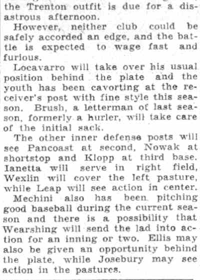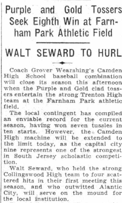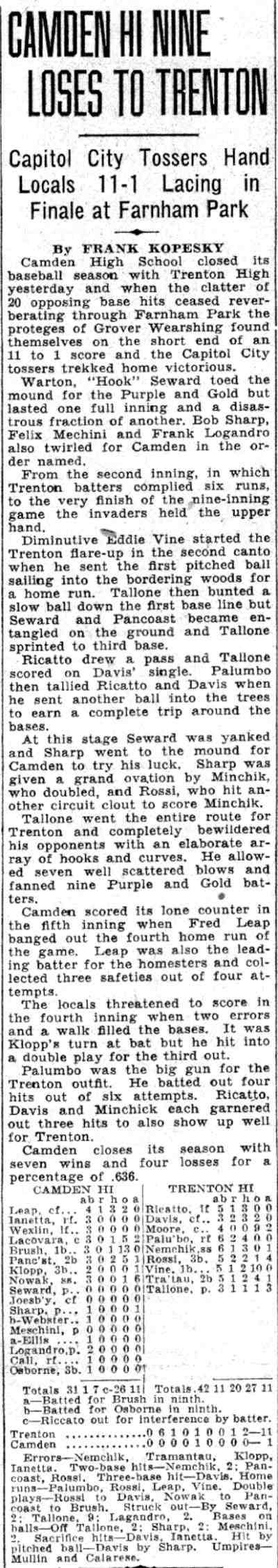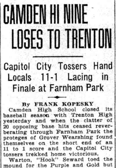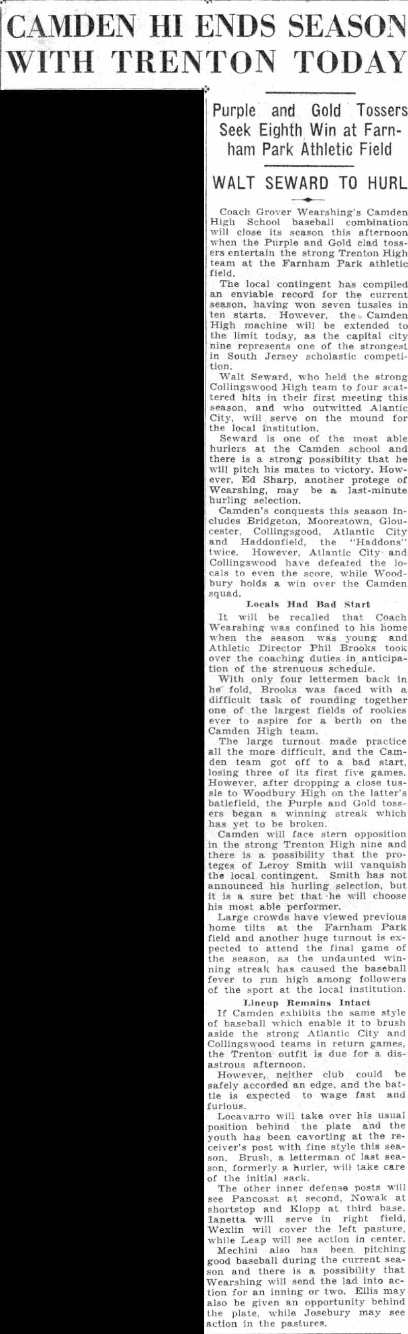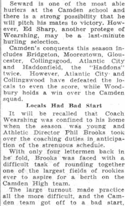 were also announced. Brooks and Mozeleski will coach the various sports at the academic institution, with the latter more than likely taking over football and track and the former basketball and baseball. Brooks, however, will be in charge of the physical department. Mozeleski comes back to his alma mater after having had wide success in college sports and in coaching. "Mitch" attended William and Mary College and captained the football and basketball teams in his senior year, while also earning a letter in track. Following graduation from the Virginia college, Mozeleski coached at a Virginia military academy. Mozeleski is well versed in football and is expected to turn out a formidable team this year at the academic institution. Still, he will have to find plenty of new material, as a number of the present gridders have transferred to the Woodrow Wilson Commercial High School, located at 32nd and Federal Streets. grover "worm" Wearshing, who assisted in the physical ed department at the local school during the past three years, and tutored the football and baseball teams, will take charge of that department and athletic teams at the Woodrow Wilson High School. As yet no assistant has been named for wearshing, but within the next few weeks an announcement will be made by the board of education. Frank Sias, who was on the physical ed staff at the local high school and coached track, has been appointed as physical instructor at cramer junior high school and will be assisted by mary ladewig, another former camden high grad, who has starred on the cinders for temple university and meadowbrook, holding a number of middle atlantic a. a. u. records.