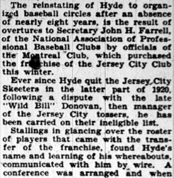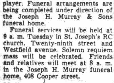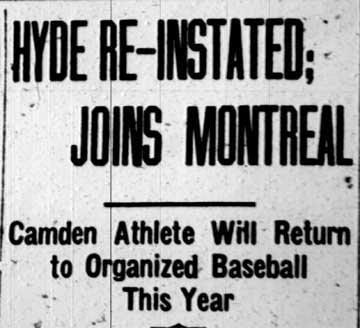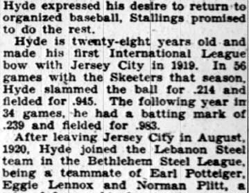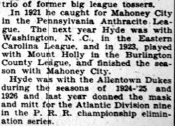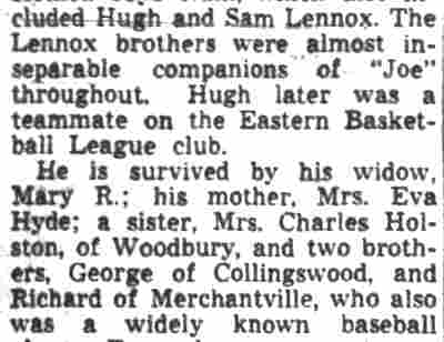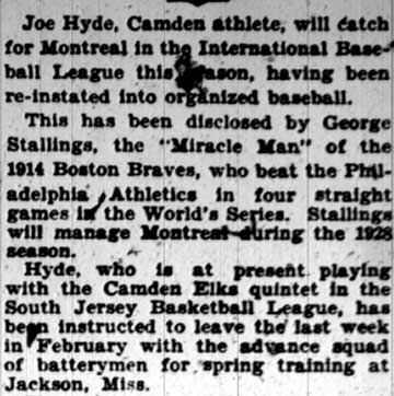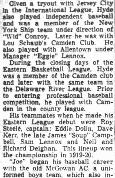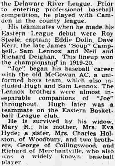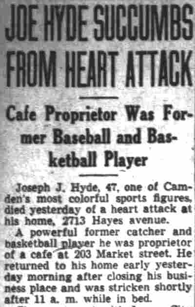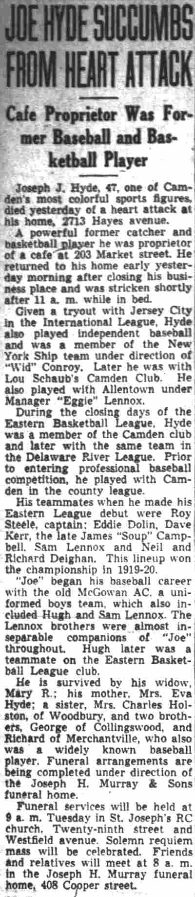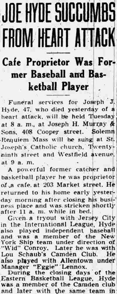 JOSEPH J. "JOE" HYDE was an all around athlete, was well known in Camden as a a professional basketball player and also played minor league ball. In his later years he operated a bar at 203 Market Street. He is not to be confused with Joseph F. Hyde or Joseph F. Hyde Jr., who owned Hyde's Cafe (aka Hyde's Saloon) Saloon at 1600 South 6th Street from the 1900s into the 1950s.was a open for business as early as 1906, and was still trading under that name as late as 1947. Joseph J. "Joe" Hyde was born in 1897. He was the youngest of four children born to Richard Hyde Jr. and his wife, the former Eva Smith. coming after Elizabeth, George and Richard. His father worked as representative of a Philadelphia brewery. Richard Hyde had also worked as Camden policeman for a year in the 1890s. Joe Hyde's grandfather, Richard Hyde Sr., had been a constable and a Camden County freeholder from the Seventh Ward in the 1880s. His uncle, Joseph F. Hyde Sr., owned a bar at 1600 South 6th Street, Hyde's Cafe. Sadly, Richard Hyde died at the age of 50 in January of 1913, Joe Hyde played professional and semi-pro baseball in the 1910s and throughout the 1920s. After starring locally with semi-pro teams, Joe Hyde, broke into organized baseball as a catcher with the Jersey City Skeeters of the International League in 1919. He returned to Jersey City in 1920, but left the team after getting into a dispute with manager "Wild Bill" Donovan. Suspended from organized baseball, Joe Hyde played with the Lebanon Steel team of the Bethlehem Steel League, where he was the teammate of former major leaguers Eggie Lennox, Norman Plitt, and Earl Potteiger, who would go on to coach the New York Giants of the National Football league in the 1920s. Joe Hyde played for a series of semi-pro teams until 1928, when he was reinstated into the pro game at the behest of George Stallings, who also had managed at the major league level, taking the 1914 Boston Braves to the World Series, and sweeping Connie Mack's Philadelphia Athletics in four games. Joe Hyde caught at least one game for Montreal of the International League that summer. He played for Allentown of the Eastern League in 1929. Joe Hyde made his professional basketball debut during the 1919-1920 season, with the Camden Crusaders of the Eastern Basketball League. The Crusaders were owned by Camden veterinarian Dr. Charles B. Helm and former Camden Counnty Sheriff W. Penn Corson. Other team members included brother neil deighan, Eddie Ferat, Sam Lennox, Jimmy "Soup" Campbell, Roy Steele, and another rookie, Rich Deighan. The Crusaders were the 1919-1920 Eastern Basketball League champions. He stayed in the game, although not at that level, then the pinnacle of pro hoops. Joe Hyde returned to the pro ranks with the Camden franchise of the 1928-29 Eastern Basketball league. The EBL was then a shadow of its former self, and must be considered a semi-pro league at best. The Camden roster as known included Joe Hyde, Rich Deighan, Sam Lennox, and two other players named Leach and Mulligan. The team lost all ten of the games it played before folding.