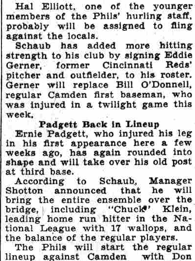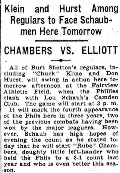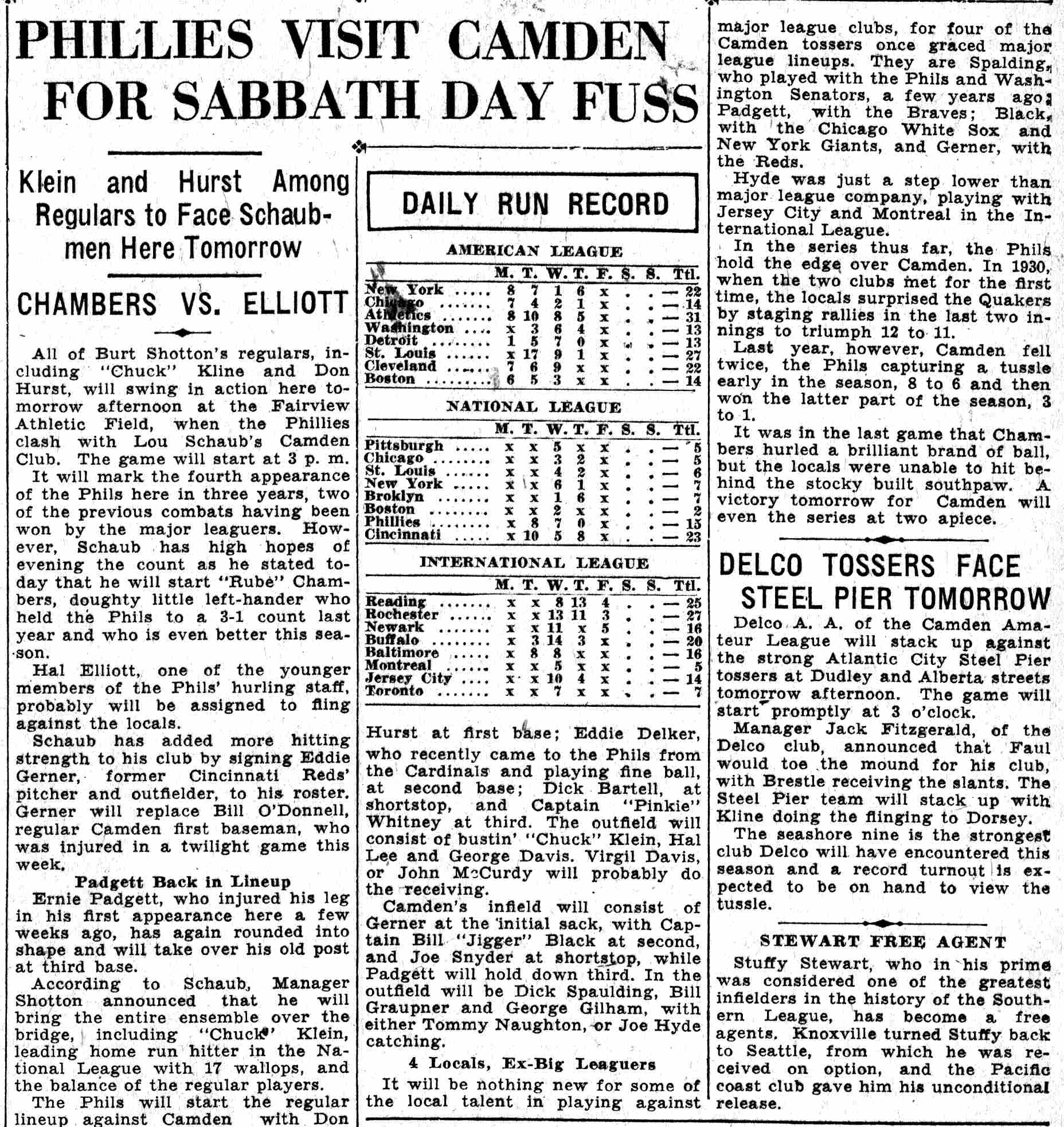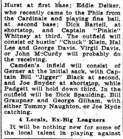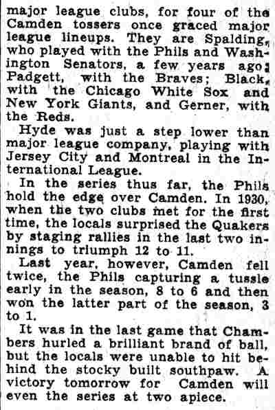 BLACK YANKS HERE IN DOUBLE-HEADER Probably the greatest collection of colored talent in the country will perform before local fans tomorrow afternoon at the Fairview Athletic Field when the New York Black Yankees and Lou Schaub's Camden Club engage in a double-header. The opening game is slated to start promptly at 2 o'clock. This will be' the first appearance of the New Yorkers here this season. Schaub had originally scheduled them for the opening game of the season, but rain forced the cancellation of, the game Due to the fact that the Yankees, happened to have an open date for this Sunday,Schaub immediately grabbed the chance of bringing this fast-moving outfit here. The players comprising the New York ensemble are of the best in the country and is the finest collection of stars gathered in one team. They have a pitching staff that ranks with the best, namely, ”Reds" Ryan, Phil Rolland, Luther Farrell and Gandy. A number of other out-standing players who will be in the lineup are Yancey, Riggins, Smith, Rector, "Fat" Jenkins and George Scales, who also manages the club. The Yanks have taken on all kinds of opposition since the season started and have made the best bite the dirt. The most recent visit of the New Yorkers in the section was last Tuesday when they defeated the Mayfair Club of Philadelphia, a team which also bowed to the Schaubmen. schaub announced that the pitching assignments will be turned over to the veteran johnny "rube" Chambers and Jack Kimble, Wildwood High athletic director, who has been twirling splendid ball for Camden this season. Tommy Naughton and Joe Hyde will take care of the receiving, with the former probably donning the mask and windpad in the opener. The local infield will be taken care of by Bill O'Donnell on first with Bill "Jigger" Black at second, and Joe Snyder at shortstop, while either Ernie Padgett or Fritz Schadel will hold down third base. In the outfield will be Dick Spalding, George Gilham and Bill Graupner, the latter having recently graduated from the University of Pennsylvania, where he captained the nine. |