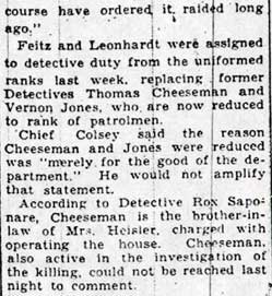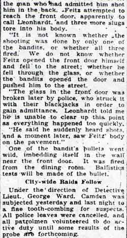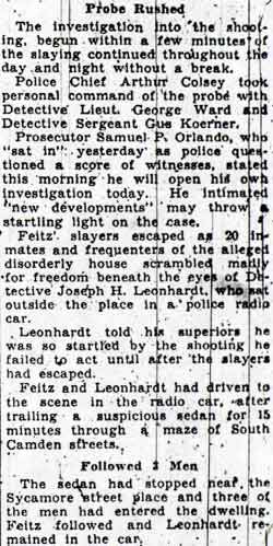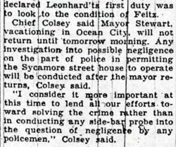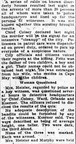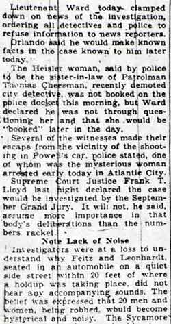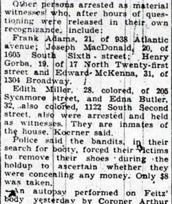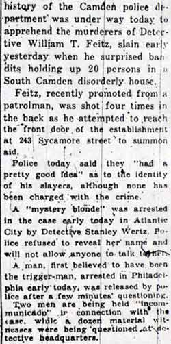 Decision on any action to be taken against Stanley Wirtz, suspended Camden detective charged with having furnished the guns and automobile for a holdup, will be made today by Commissioner Mary W. Kobus and Police Chief Arthur Colsey. Wirtz, with Sergeant Gus Koerner and Detective Clifford Carr, was questioned yesterday, and decision was reserved. Prosecutor Samuel P. Orlando, however, said he would place the case before the grand jury. The charge involved the attempted holdup of the Eavenson & Levering Company payroll, in which one of the alleged bandits was captured at the scene last Friday night. "No charges have been preferred against Wirtz,” Mrs. Kobus announced after the investigation. "And I don't believe any charges will be made," Colsey commented, adding: "Commissioner Kobus and I are going over the reports and statements of all concerned at 10:00 AM tomorrow and a decision will be made then.” Suspended TuesdayWirtz was suspended Tuesday after County Detective Chief Lawrence T. Doran announced Wirtz had admitted supplying the pistols and car, allegedly used in the abortive attempt to obtain a $800 payroll at the wool-scouring plant. Wirtz was still under suspension last night, Colsey announced. William B. Macdonald, court stenographer, recorded the statements made by each man, Koerner and Carr were "planted" in the office of the company before the holdup and frustrated the attempted crime, capturing Walter Lewandowski, 24, of 924 Atlantic Avenue. "All three made full statements to us," Colsey said and then declined to reveal what the statements contained. Denies Stories ClashAsked if there was any conflict between the statements made to Doran and those made to Mrs. Kobus and him, Colsey said: "No, I wouldn't say so." Wirtz appeared briefly before the commissioner and chief at the start of their probe, which was conducted in Mrs. Kobus' office. He left the room after about two minutes and told reporters, sitting outside: "I refused to make a statement. I made one yesterday and that is enough." Mrs. Kobus, however, said Wirtz did not refuse to make a statement but, instead, asked for a little time to consider his statement. "He said he had been In court all day and was nervous,” Mrs. Kobus said. No Charges MadeAsked for a statement at the conclusion of the investigation, Mrs. Kobus said: "No charges have been preferred against Wirtz, This was not a hearing on any charge. This was an investigation of reports which I read in the newspapers. It is the duty of the police officials to investigate any such report, and Wirtz and the other two detectives who figured in the case were called in to make statements. 'This was not, a trial and I do not care to make a statement now about what went on." The suspension of Wirtz came after an investigation was ordered into a statement made by Lewandowski. Lewandowski charged that he had been "framed" by Joseph Powell, a police stool pigeon. He named Powell as the one who "planned the holdup" and, said Powell then informed Wirtz of the plans. Rearrest MadeDoran said Wirtz admitted dealing with Powell and giving Powell two pistols and an automobile for use in the holdup. As a result Powell, who had been arrested and released by city police, was rearrested by the county detectives. In addition, Leonard “Rags” Rogalski, 20, of 1219 South 10th Street, was arrested by the county detectives. They said Lewandowski told them Rogalski originally was intended to take part in the holdup but got "cold feet," and backed out at the last moment. Powell, Lewandowski and Rogalski are held in the county jail. When informed last night of the statements made by Mrs. Kobus and Colsey, Prosecutor Orlando said: "I have nothing to do with the discipline of the police department. I will present the full facts of this holdup to the grand jury and, that body may take any action it desires." Jury to get CaseAsked if he would request an indictment against Wirtz, Orlando said: "I will give the grand jury the full facts. The members will decide for themselves what action to follow." Doran was in conference briefly with Mrs. Kobus and Colsey before the three detectives were questioned. He said he gave them statements made by Lewandowski, Powell and Rogalski, and also by Wirtz. Later Doran returned to Mrs. Kobus' office with a copy of charge of carrying concealed deadly weapons, preferred in 1930 against Lewandowski in 1930, when Lewandowski was 18. This charge was no-billed, Doran said. "He was listed as a mental case," Doran said, "and was examined by the county physician and pronounced O.K." |