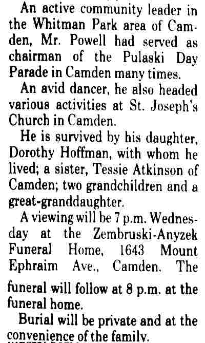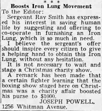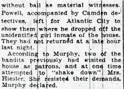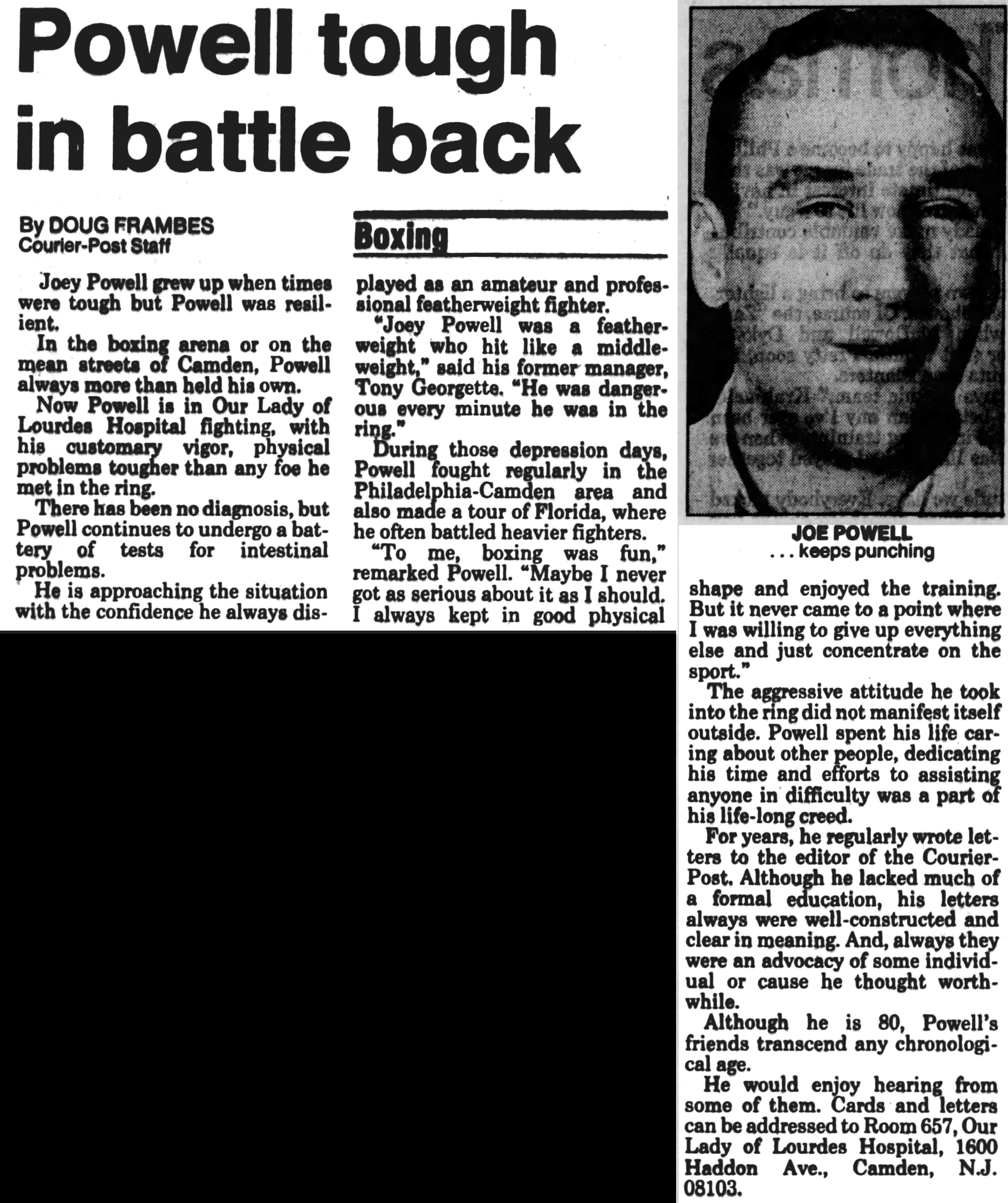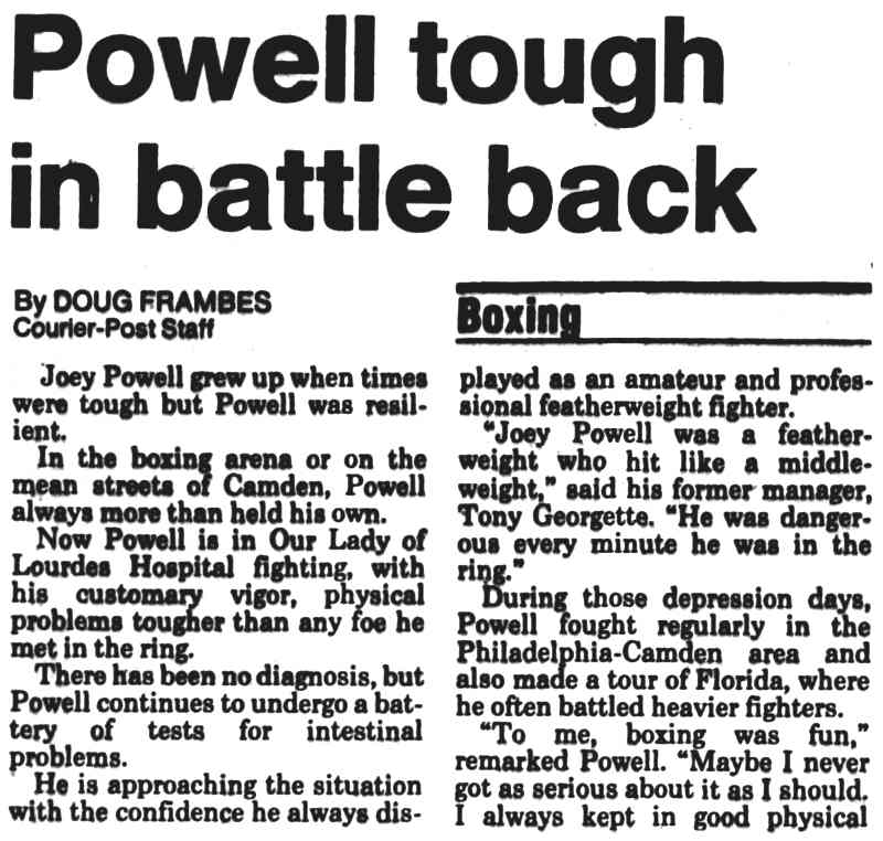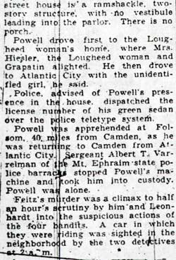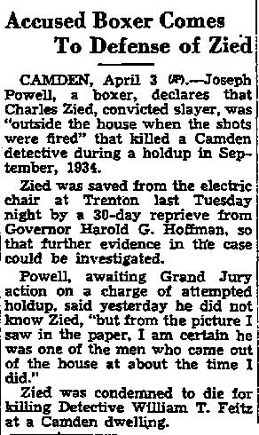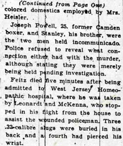 'JOEY' POWELL REARRESTED AS COUNTY OPENS HOLDUP PROBEOrlando Acts as City Cops Free Former Boxer in Payroll PlotFRAMEUP CHARGED BY ANOTHER SUSPECTPrisoner Says Ex-Fighter Got Him in on Theft, Tipped PoliceJoseph "Joey" Powell, former boxer who was arrested by city police in connection with a South Camden holdup and subsequently released, was rearrested by county detectives last night. Powell was taken into custody on orders of Prosecutor Samuel P. Orlando, who also ordered the arrest of a second suspect. Camden police turned the case over to the prosecutor's office after the arraignment of Walter Lewandowski, who was caught in a police trap Friday night as he allegedly attempted to steal an>$800 payroll at the Eavenson & Levering Company's plant at Fourth Street and Ferry Avenue. He formerly was employed there. Two Others ImplicatedLewandowski implicated Powell, 25, of 46 Woodland Avenue, and Leonard Rogalski, 20, of 1219 South Tenth Street, in a plot to steal the payroll, according to Police Chief Arthur Colsey. Powell thereupon was taken into custody and questioned, then, according to Colsey, he was released temporarily, in his own recognizance, pending further investigation. Rogalski was not arrested until County Detectives James Wren and Casimir Wojtkowiak took him in last night. The same detectives arrested Powell. Both suspects were charged with attempted holdup and robbery and committed to the county jail. Lewandoski,24, of 924 Atlantic Avenue, also in county jail, committed without bail by Police Judge Lewis Liberman Saturday. According to Chief Colsey, Lewandowski made a statement in which he accused Powell of plotting the holdup and making him the “goat.” "The holdup was Powell's idea,” Colsey quoted Lewandowski as saying. "He got me in on it, and Rogalski was supposed to take part, too. Rogalski got “cold feet” though, and Powell sent me in while he was supposed to watch outside.” "Instead he beat it because he had tipped off the police that the place was going to be held up." Released After QuizOn the strength of Lewandowski's statement, patrolman Edward Suski was sent to arrest Powell. After questioning, however, the former pugilist was released. "We found no evidence against Powell," Colsey explained. "Lewandowski's story looked like an attempt to get himself off easier. "We turned the case over to the prosecutor's office, as we always do after making an arrest that seems to clear up the case." Lewandowski was captured by Sergeant Gus Koerner and City Detective Clifford Carr. The detectives were tipped off that the factory office was to be held up and laid in wait for the man. When Lewandowski showed up, Carr and Koerner pointed revolvers at him. He fled down a stairway and Carr fell on him. The two grappled and the detective says the man pointed a .32 caliber pistol at him. Carr overpowered him with blow on the head with the butt of his revolver. |