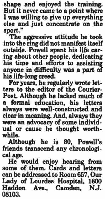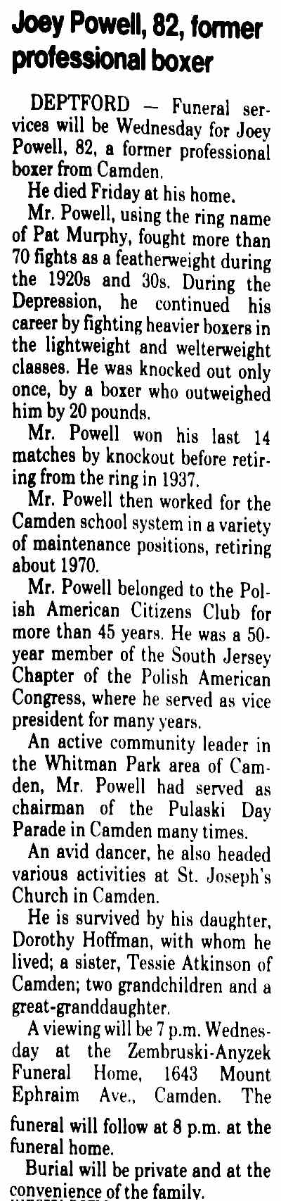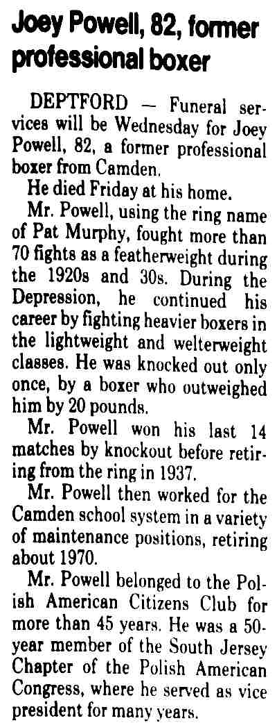 JOEY POWELL was another one of the fine crop of boxers that came out of Camden in the 1920s and 1930s. H was born in Camden, New Jersey on December 17, 1909 to John J. Pawelek and his wife the former Katarzyna Zajac. His parents had moved to Camden not long after the birth of his brother Stanley Pawelek. Five daughters were born after Joseph's birth, Nellie, Teresa, Cecilia, Mary and Angela Pawelek. Both brothers "Americanized" their names in the 1920s and were in the newspapers quite often, Joey Powell as a boxer. Stanley Powell for getting in trouble with the law. Joey Powell remained active in boxing after he left the ring as a member of Camden's Veterans Boxing association Ring 6. His list of well-wishers for the banquet program of 1959, which honored Sgt. Ray Smith, is an interesting mix of boxing figures, policemen, politicians, journalists, and bar owners. He was also active in his community, with St. Joseph's Roman Catholic Church in Camden, the Polish American Citizens Club of Camden, he South Jersey Chapter of the Polish American Congress, and he served many times as the chairman of the committee which sponsored and organized Camden's Pulaski Day parade and celebrations. Last a resident of Deptford, New Jersey, Joey Powell died at home in November of 1992. |