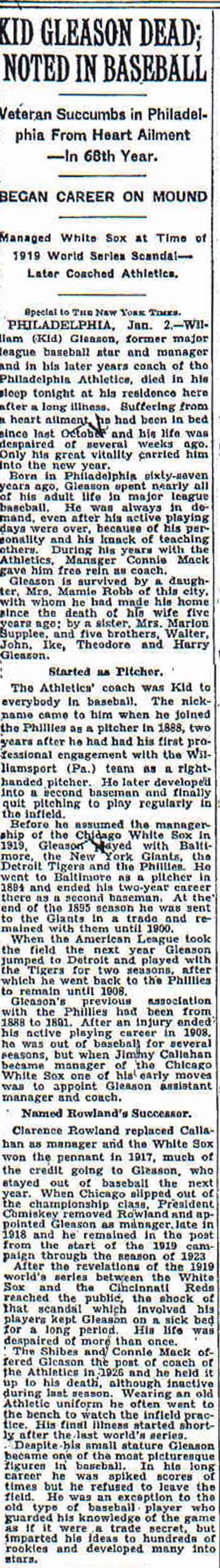 treasurer. After playing ball in and around Camden, he went with another Camden ballplayer, Charles Alcott, to Williamsport in the Pennsylvania State Association league in 1887. Both men later played for the Scranton team in the same league later in the same season. At seasons end he returned to Camden and played for the Camden club alongside of Bill Eagan. William Gleason reached the major leagues in 1888 as a pitcher for the Philadelphia Phillies. Nicknamed Kid in part because he was 5'7" but mostly for his enthusiasm, Gleason would go on to play 22 seasons in the majors, and remained in the game as a coach and manager until his death in 1933. Kid Gleason's first eight years in the big league were spent mostly as a pitcher, although he made occasional appearances in the outfield and at second base. He began as a pitcher with the Phillies. His best season on the mound was 1890. After two losing seasons, he blossomed in 1890 when desertions to the Players' League stripped the Phillies of their regular starters. During the 1890 season he started 60 games, running up a record of 38 wins and 17 losses, with an Earned Run Average of 2.63 for the Phillies. His 38 wins is the Phillies single season record, one which will never be broken. He never approached that level again, although he twice more topped 20 wins. He won 24 and lost 22 for Philadelphia in 1891, and was sent to St. Louis before the 1892 season. He continued as a pitcher, although with reduced effectiveness until 1894, when he was sent to the Baltimore Orioles during the middle of the season. When the distance from the mound to the plate was increased in 1894, he was basically through as a major league pitcher. The Orioles won the pennant that year, and would for the next two seasons as well. Manager Ned Hanlon recognized Gleason's talent in the field and at the plate, and made him the Orioles' starting second-baseman for the 1895 season. He responded by hitting .309, scoring 90 runs, with 14 doubles, 12 triples and 19 stolen bases for the Orioles. Traded to the New York Giants for Jack Doyle in 1896, he remained with New York until 1900. While with the Giants, where he was named team captain. According to some reports, he was the first to order an intentional base on balls as a way to bypass a strong hitter. In 1897 he had his best offensive year, hitting .319 with 106 RBI. After the 1900 season, Kid Gleason was involved in a strange incident. Gleason and the Giants, along with the Brooklyn Dodgers and took a boat to Cuba for a series of exhibition games. On the boat trip over, Outfielder Tom O'Brien and Gleason were told that if they drank enough sea water they would be be sick, but would then be cured of any sea sickness. Both O'Brien and Gleason became violently ill following the prescription, but O'Brien was so affected that all his internal organs were damaged, and he never recovered, passing away in Phoenix AZ on February 28, 1901. In 1901 Kid Gleason jumped to Detroit in the new American League. He played their for two years, returning to the Phillies in 1903, where he for all intents an purposes finished his career as an everyday player in 1907. He appeared in two games as a replacement for the Phillies in 1908. Kid Gleason spent 1908, 1909, and 1910 for the most part as a minor league player-manager. In 1911 he took a job as a coach with the Chicago White Sox, and appeared in one game as a player in 1912. When the White Sox won the American League pennant and the World Series in 1917, he was given much credit for the achievement. Kid Gleason was out of baseball during the the 1918 season. He was named manager for the 1919 season, and won the pennant by four games with an 88 and 52 record. The White Sox were a fine team with many great players, but their was a cancer in the clubhouse. Upset by the low pay and meanness of owner Charles Comiskey, several White Sox players, when approached by gamblers, agreed to throw the 1919 World Series. Kid Gleason took the White Sox through the 1920 season, finishing second by three games to the Cleveland Indians. Talk of a possible fix in the 1919 Series had continued through the winter months into the 1920 season. In July, Gleason ran into gambler Abe Attell at a New York bar. Attell confirmed Gleason's suspicions about the fix. "You know, Kid, I hated to do that to you," Attell told Gleason, "but I thought I was going to make a bundle, and I needed it." Attell revealed that Arnold Rothstein was the big money man behind the fix. Gleason went to the press with the story, but was unable to convince anyone--because of fear of libel suits--to print it. The Black Sox, as it was called, scandal broke wide open in September of 1920. Team owner Comiskey suspended the compromised players with a few games left in the season. The Sox lost these games, and the pennant. Gleason was absolved of any guilt in the affair, and continued as White Sox manager until 1923. His teams however, stripped of many of their better players, did not fare well, and Gleason's White Sox would not be better than a .500 ball club after 1920. He was let go as manager after the 1923 season. After two seasons away from the major leagues, Kid Gleason was offered a position as a coach with Connie Mack's Philadelphia Athletics. He would return to the World Series with the A's in 1930 and 1931. Seriously ill during most of 1932, Kid Gleason passed away from a heart ailment in Philadelphia on January 2, 1933. He was buried at Northwood Cemetery on Philadelphia PA. Kid Gleason's younger brother, Harry Gleason, played parts of five years in the major leagues as well, for Boston and St Louis in the American League, from 1901 through 1905. Another brother, Isaac "Ike" Gleason, was well known as a player, manager, and especially as an umpire in local baseball circles. Kid Gleason was inducted into the South Jersey Baseball Hall of Fame in 1993. |