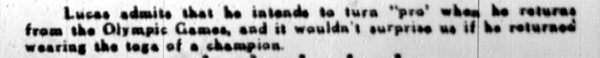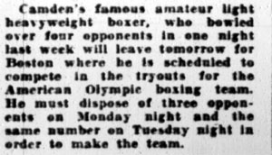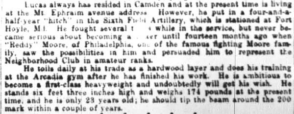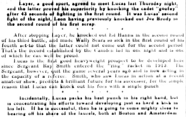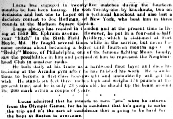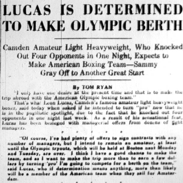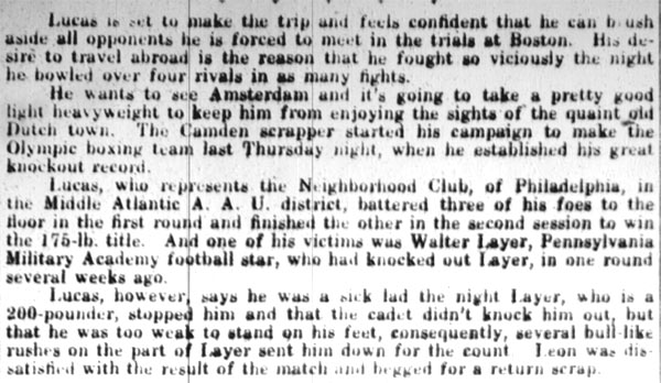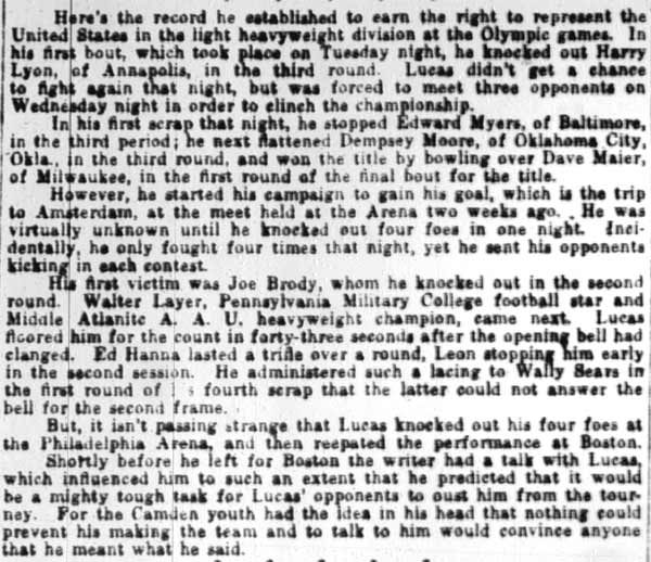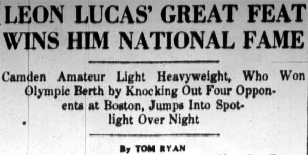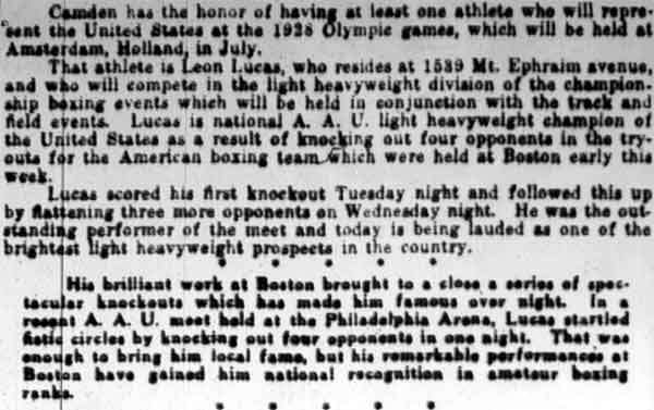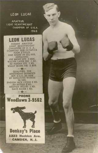 LEON LUCAS was born in Camden, New Jersey on September 4, 1901. His parents were immigrants from Poland. At the age of 18 he was living at 1103 Louis Street and working at one of Camden's shipyards. He lived at 1539 Mount Ephraim Avenue in Camden NJ, and was working as a hardwood floor layer in late 1926 when he took up boxing, working out at the Arcadia gym in Philadelphia. In one night in Philadelphia, April 12, 1928, he defeated four opponents, all by knockout, to qualify for the AAU finals, which determined the makeup of that year's American Olympic team. A light heavyweight, he defeated Dave Maeir of Milwaukee in 1928 to win the Amateur Athletic Union light heavyweight title, and earn his place at the 1928 Olympics in Amsterdam.