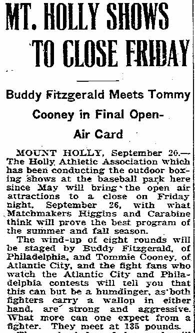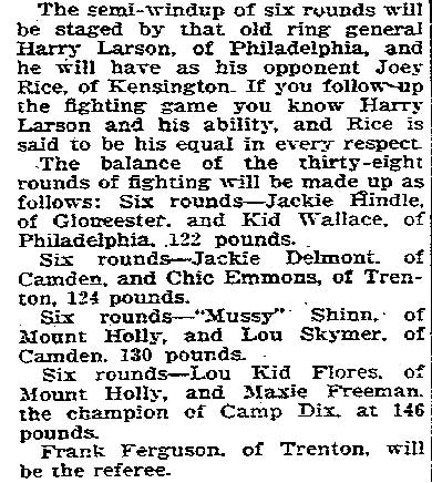 Blair Lew Skymer - Battling Mack - Joe Spearing- Frankie Rapp - Johnny Lucas - Joey Straiges - Joey Allen Sgt. Ray Smith - Tommy Ricco - Al Daley - Jackie Hindle - Eddie Chaney Caesar Campana - Young O'Connors - Charlie Mack - Pee Wee Ross - Bobby Zimmerman Buck Flemming - Joe Shannon -Kayo Palmer - Pat Lawrence- Dave Lambert Young Lawrence - Archie McNew - Lou Jackson - Al White - Young Palmer - Tommy Dundee Joe Mangold - Joey O'Donnell - Young Joe Firpo |