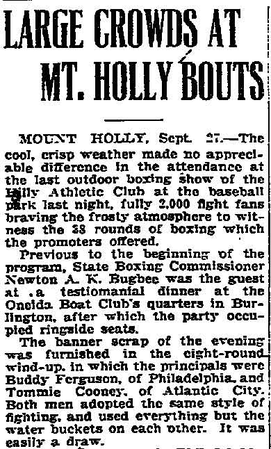 Ring 6 Committee Meets Tonight The committee on arrangements for the third annual picnic and field day to be held by Ring No. 6, VBA, will hold a meeting tonight, at 220 Cooper Street, starting at 8 o'clock. Lew Skymer and Joe Spearing co-chairmen, request the presence of all members of the committee, which includes Vic Righter, Ed Adams, Frankie Youker, Larry Hildebrand, Frank DiSalvio, A. Gartland, Bob Kavanaugh, Tom Reitzes, Patsy Carlo, Peewee Ross, Al Ambrosino. Also W. DiPaolo, K.O. Riley, John Knowles, Tommie Saul, Eddie Chaney, Bobby Zimmer, Tony Tilman, Tommy Carr, George Ealer, and William Jeffries. |