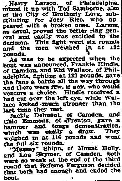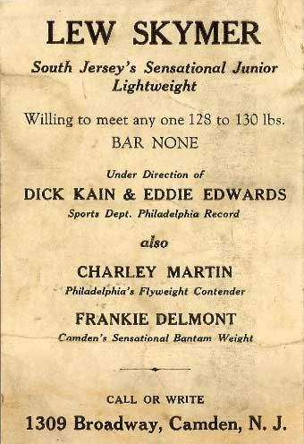 LEW SKYMER was born Louis A. Skymer on August 21, 1906 in Lycoming County PA, to Thomas A. and Mary Skymer. Both he and his young brother Thomas J. "Tommy" Skymer were talented boxers in the Camden area Golden Gloves amateur circuit in the 1920s and 1930s, the same circuit that had sent Camden boxer Leon Lucas to the Olympics in 1928. Lew Skymer had turned professional by 1926, and fought at least twice, both in that year, in the featherweight division. His one known loss that year listed at the Internet Boxing Records Archive was to Johnny Jadick, who would go on to become World Junior Welterweight champion in 1932. He also fought as a junior lightweight and lightweight. Lew Skymer would retire with a record of 49 wins against only 6 defeats, his only known (to this writer) defeat the 1928 loss to Jadick. The Skymer family moved to Camden in 1912. Thomas A. Skymer worked as a laborer for a few years, and the family lived in the unit block of South 2nd Street. In 1916 Thomas A. Skymer moved his family to 330 Mickle Street, which had been the home of famous 19th Century architect Stephen Decatur Button, and was next door to the home of the late poet Walt Whitman. Shortly after the January 1920 Census the Skymer family moved again, to 1309 Broadway in Camden, where Thomas A. Skymer had opened an auto supply business. The 1930 Census lists Lew Skymer's occupation as machinist, while brother Tommy was a painter for a sign company. A third brother, Albert, was also doing factory work. In 1928 Lew Skymer was forced to stop boxing due to a cataract in his left eye. The cataract was removed, and he was advised never to box again. Ignoring medical advice, he fought three times in 1931, before again being force to stop due to an eye injury. This time he had suffered a detached retina in his left eye, and the eye had to be removed to save the vision in his right eye. This stopped his active career, although he remained involved in the fight game for decades afterwards. By 1947, married and with his boxing days were long behind him, Lew Skymer was still living at 1309 Broadway in Camden with his wife Vera. He was still operating the family business, by the known as Skymer's Tire Service there, his father having retired in 1941. Lew Skymer was still living on Broadway as late as 1959. In later years he closed the tire business and operated a laundry on the premises. Lew Skymer kept his interest in boxing, and was a member of the Veterans Boxing Association Ring No. 6, based in Camden, and was involved in planning and producing the annual banquet which that group held. Lew and Vera Skymer moved to 1752 West River Drive in Pennsauken NJ in the 1960s, a home that had been previously lived in by Maurice A. Wolfe Jr., who was killed in action while serving with the Navy during World War II. Lew Skymer remained a Pennsauken resident for the rest of his years. His mother, Mary Skymer lived with him in her later years, passing in March of 1975. Lewis Skymer passed away on October of 1980, survived by a son, Lewis Jr., his brothers Albert and Thomas, and sister-in-law Josephine "Jo" Skymer. The Jo Skymer Lighting business was established in 1950, and has been selling lamps and chandeliers on Crescent Boulevard, near the Airport Circle since 1965. Jo Skymer Lighting is still in business as of the summer of 2003. On May 10, 1981 Lew Skymer was inducted into the Pennsylvania Boxing Hall of Fame, at a banquet held at Palumbo's, in South Philadelphia. |