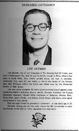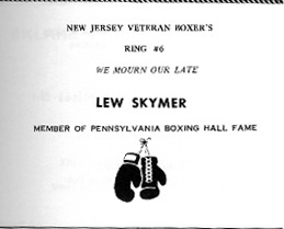 Lew Skymer, one of our inductees in The Boxing Hall of Fame, was born in Williamsport PA, later he and his family moved to Philadelphia. After a few years in South Philly, they finally moved across the river in Camden. Incidentally, they were the last family to live in the home of the famous poet Walt Whitman, before the home was taken over by the Historical Society of New Jersey.* Lew Was a great prospect. He had a good winning record against some outstanding fighters including Johnny Jadick, George Amblard, the French lightweight champion, Hubert Gillis champion of Belgium, Mickey Blair, Roxie Allen, Jackie Hindle, Joe Wilton, Ernie Glaser and many other good young boxers of that period. Poor eyesight forced his premature retirement at the early age of 21. However, boxing was not the only reason for the committee to select Lew Skymer to the Hall of Fame, character and class were. |