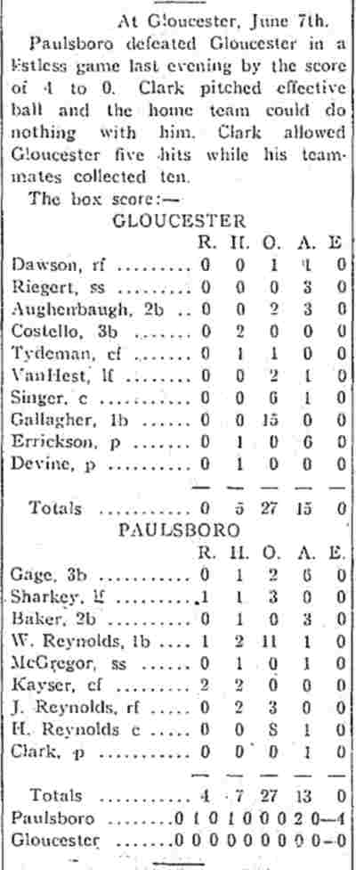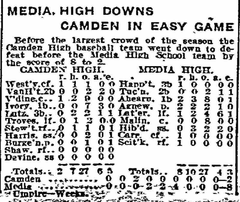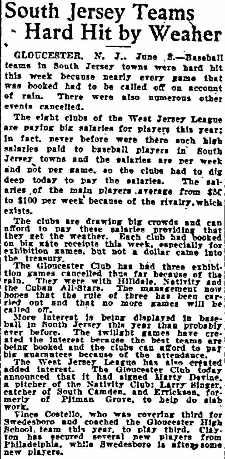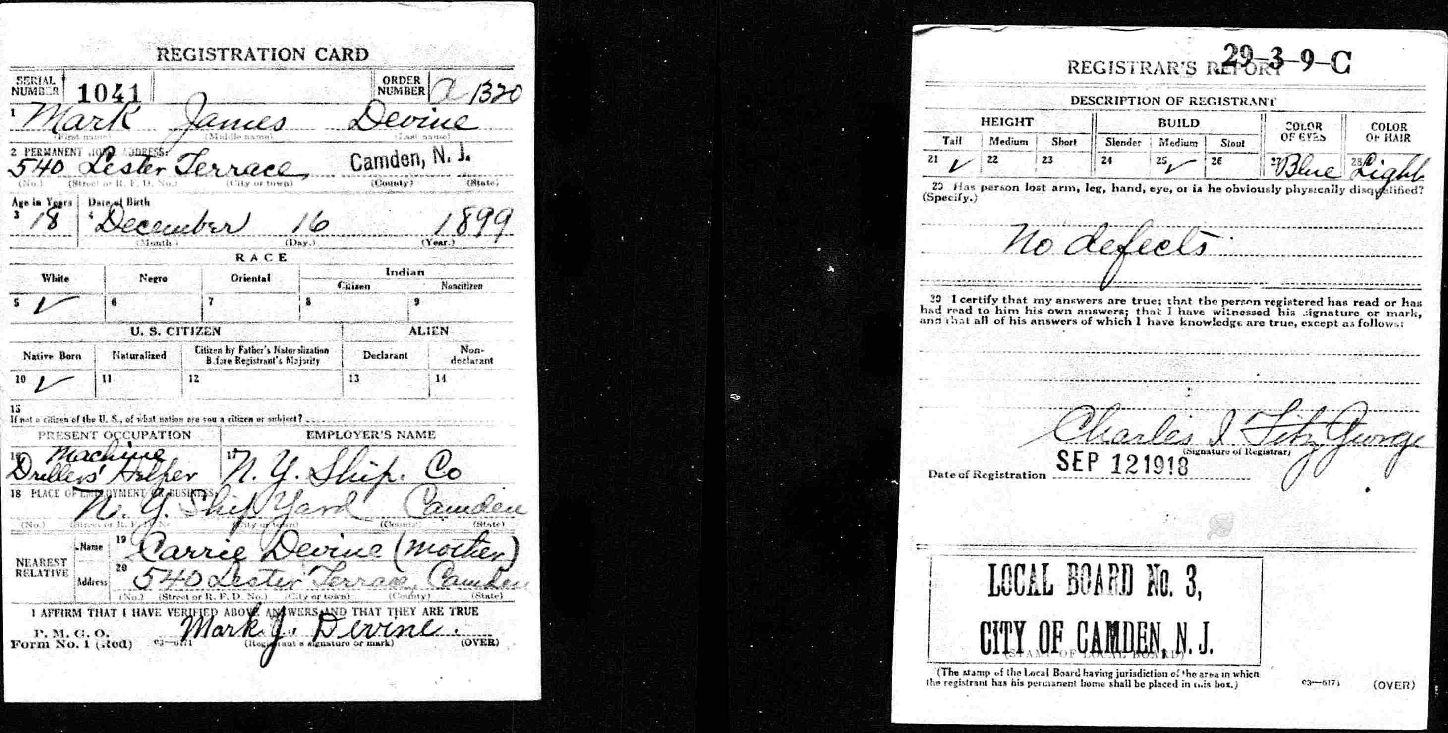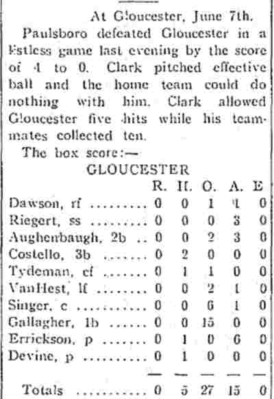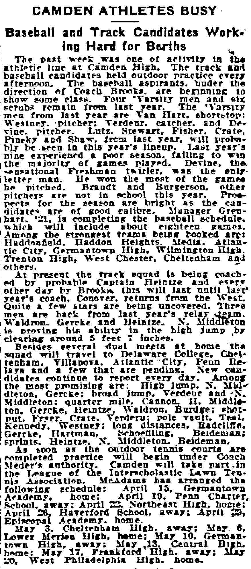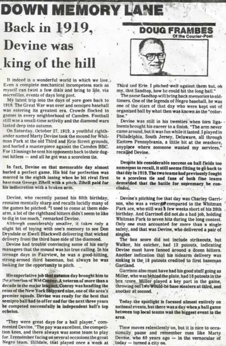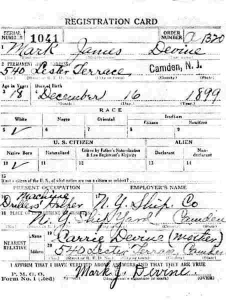 MARK JAMES "MARTY" DEVINE was well known in Camden in the late 1910s and 1920s as a scholastic and semi-pro baseball player, pitching for Camden High School and any number of semi-pro teams in the tri-state area until an arm injury ended his career on the diamond. Marty Devine was born in Pennsylvania on December 16, 1899 to Mark and Carrie Bauer Devine. The Devines were living on Jones Lane in Philadelphia when the 1900 Census was enumerated. A brother, James was born in 1902. Sadly, his father died on April 22, 1908 in a work-related mishap at the too-young age of 1928. Carrie Devine and her sons first appear in Camden's City Directories in 1911, at 714 Ferry Avenue. They remained there for at least a year. When the 1917 Directory was compiled the family had moved to 540 Lester Terrace. A fine pitcher, Marty Devine attended Camden High School and was an immediate success on the baseball diamond, winning most of the games he started on an otherwise mediocre team. He soon was pitching for any number of semi-pro teams in Camden and the tri-state area. Marty Devine apparently left Camden High briefly, as he was working at the New York Shipbuilding Corporation shipyards near his home in September of 1918 when he registered for the draft. His work probably had more to do with being a member of the company baseball team than anything else. He returned to Camden High in time for the 1919 baseball season. Marty Devine pitched for New York Ship in 1919 and 1920, for the Gloucester baseball team in 1922, and for Lou Schaub's Camden club in 1923. These are just the teams this author is aware of as of this writing. The Devines are listed in Camden City Directories from 1921 through 1923 at 2220 South 9th Street. Marty Devine married Frances Miles around 1924. By 1930 there were four children, Mark Jr. and Dolores. Two more sons, Paul and Thomas, came during the 1930s. The Devines had moved to 2266 South 7th Street when the 1924 Directory was compiled and were still at that address as late as 1980. Younger brother James Devine founded a coal and ice business in the 1920s, and Marty worked for him as a driver for many years. When he registered for the draft in April of 1942, Marty Devine was again living at 540 Lester Terrace. A Camden resident to the end, Marty Devine passed away in January of 1986. His wife joined him on August 8, 2002. |