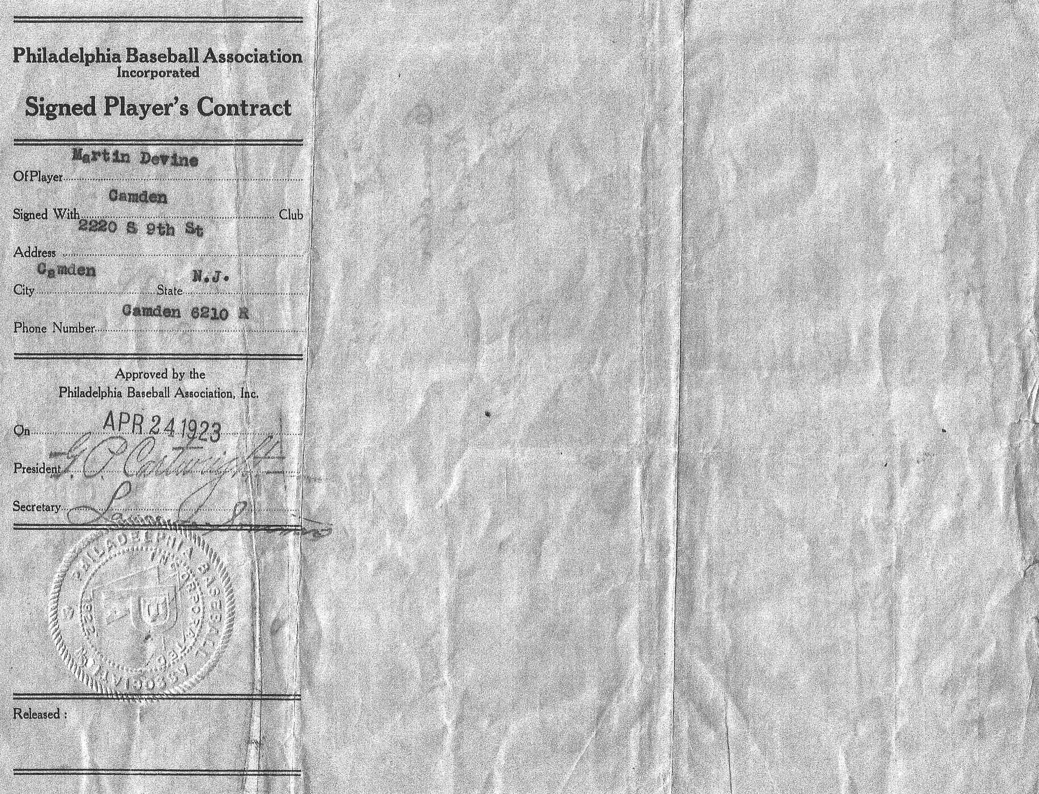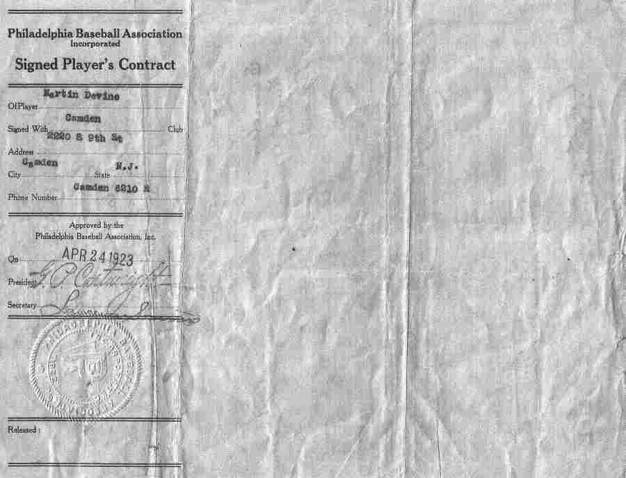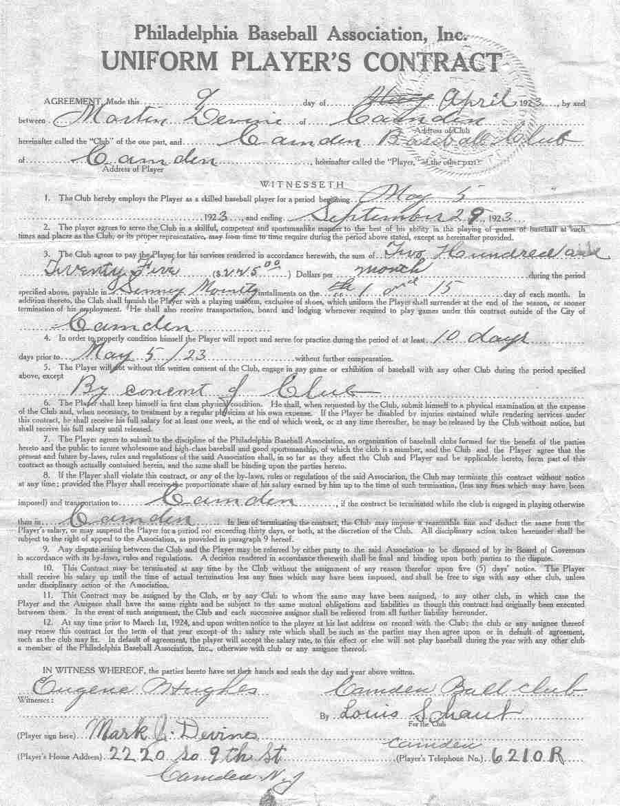 Contract to Play for the Camden Baseball Club - April 9, 1923 lou schaub - marty devine - eugene hughes |