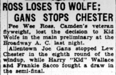 Allen Starts New Year in Impressive Style By Tom Ryan The year of 1928 evidently is going to be kinder to Roxie Allen, one of the best local lightweights, than the last one and 1927 can not be said to have frowned upon the pugilistic careers of the downtown Italian, despite the fact that he lost his first scrap that year Allen started off the New Year on the right foot by defeating Al Del Galdo, clever New York thumper, in the feature eight-round bout at the Convention Hall last night, while the same day last year he took one of the niftiest pastings of his career when he encountered Basil Galiano, of New Orleans, at the Philadelphia Arena. Allen won four rounds of his scrap with Del Galdo, while the invader carried three and one was as even as a carpenter’s level. Two of the other four settos on the night’s program terminated in knockouts, while the other brace of jousts went the limit. Kid Boots and Joey Michaels, the Long and Short knockout twins of Riverside, again stepped into the limelight by carting their rival foemen in rapid-fire order. Michaels knocked out Jimmy Costello of Philadelphia, in the second round, while Boots flattened Stanley Criss, another Pere Penn scrapper, in the first round of the third bout. Grande Proves Too Elusive For RossFrisco Grande, of New York, proved too elusive for Pee Wee Ross, local flyweight, in the eight round semi-final and won hands down. Jackie Hindle, another local product, also finished on the short end of the verdict in his fracas with Joey Blake, of Conshohocken, Hindle’s wildness leading to his downfall. However, the main fracas held the interest of the crowd as Del Galdo was confident before the contest that he would overpower the local Italian. Al simply failed in what many another mitt wielder has felt certain he could accomplish as Allen was crafty enough to take the lead during most of the fuss, and, after jolting home a few shots at long range, would sew Al up tight as a drum when they came to close quarters. Allen was clearly entitled to the verdict as he landed far more punches than Del Galdo, took the initiative more often and sustained less damage than the good-looking New Yorker. The downtown Italian one-twoed his way to the decision, first stabbing his left to the head, then crossing with the right to the same spot. Del Galdo centered his attack upon Allen's body for the first six rounds and attained very little for his efforts as that is one of Allen's strong points and a spot on which few of his opponents ever attempt to stage an assault in order to beat him. But Del Galdo wised up after the sixth, shifted his attack to the head in the seventh and almost brought Allen to the mat with a crushing right hook to the jaw. It was the hardest punch of the bout and Allen's knees sagged a bit under the impulse of the wallop, which forced him to hold until he collected his bearings. After the break Al followed up with a stiff left hook to the body and Allen did the sailor’s hornpipe for the remainder of the round. That was Del Galdo’s best session, and the only round in which either lad was in a precarious position. Allen's best round was the fifth. In that period he hit Del Galdo with at least a dozen rights on the chin, but none of the slams carried enough pressure to daze the New Yorker, who kept coming forward after every punch. Allen also carried the final session by quite a fair margin, and gave Al plenty of “roughing” in doing so. There was little to rave about the first four rounds, one or two mixups on the ropes constituting the major part of the scrapping, but those scrambles led the fans to belies that something might turn up in the closing sessions and it did. Allen had won the first and third rounds by mere shadows, while Del Galdo copped the fourth with the second being even, but from the fourth on the boys stepped on “it” and finished in whirlwind fashion. Last Four Rounds of ActionAllen romped away with the fifth in great style; Del Galdo came back and won the sixth and also grabbed the seventh, while Allen fought his way back to an edge in the eight and every session was crammed full of action. All things considered, it was a satisfactory skirmish and sent the mob home well pleased. The surprise of the night cropped up in the semi-final. Ross, who has been traveling at a fast pace in his last few bouts, was expected to win over Grande, but alas and alack, Pee Wee stubbed his toe. Grande proved to be a regular whill-of-the-wisp and Ross found it difficult to locate the bigger portion of the foe. Grande displayed a dandy left hand. In fact, he did more tricks with it than a monkey can do with a peanut. He jabbed, hooked, and uppercutted with his unorthodox plan until Ross appeared to be bewildered. Nevertheless Pee Wee finished strong and had Grande holding in the final session. Grande copped five rounds, four of them by wide margins, while Ross gained a slight edge in the fourth and sixth and won the eighth by a wide gulf. Ross weighed 110½ while Grande came in at 114 pounds. While Hindle won three rounds of his skirmish with Blake the latter won the periods credited to him by wider margins than any credited to Jackie. The local lad carried the first three rounds, while Blake carried off the honors in the last half of the battle. hindle's Wildness Loses TiltThe fact that Hindle has been inactive for a long period was very much in evidence last night and was the main cause of his losing the verdict. His judgment of distance was weird and lost him the fuss. He missed any number of swings, which if they had found their mark would have been moiré than enough to have enabled him to romp home a winner. But Jackie was away off, and as a result Blake, an awkward southpaw, got in many telling uppercuts due to Jackie's missing. Hindle, however, fought his usual courageous battle and with a few more fight under his belt should be ready to tackle far bigger game than Blake. The Pennsylvanian was three pounds li