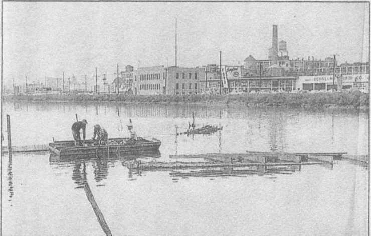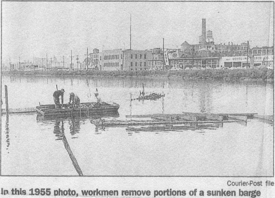 In this 1955 photo, workmen remove portions of the sunken barge |
