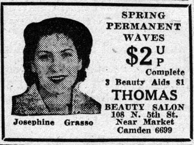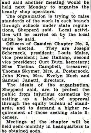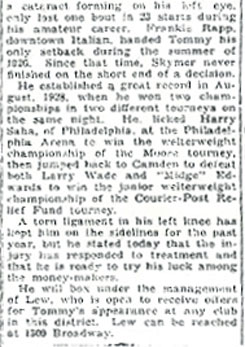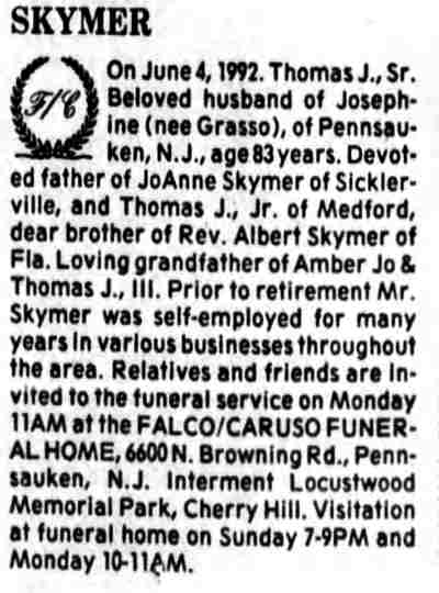 TOMMY SKYMER was born Thomas J. Skymer on May 21, 1909 in Lycoming County PA, to thomas a. and mary skymer, both of whom were born in italy. both he and his older brother Louis "Lew" Skymer were talented boxers in the Camden area Golden Gloves amateur circuit in the 1920s and 1930s, the same circuit that had sent Camden boxer Leon Lucas to the Olympics in 1928. After the birth of youngest son Albert, the Skymer family moved to Camden in 1912. The Skymers are listed at 6 South 2nd Street in the 1913 and, 1914 Camden City Directories, then at 4 South 2nd Street in the 1915 edition. Thomas A. Skymer worked as a laborer during these years. In 1916 Thomas A. Skymer moved his family to 330 Mickle Street, which had been the home of famous 19th Century architect Stephen Decatur Button, who designed the Richard Fetters School and the City Hall that was in use prior to the current one was constructed. This house also was next door to the home of the late poet Walt Whitman at 328 Mickle Street. Thomas A. Skymer also ventured into business in 1916, operating a jitney service that ran from 9th and State Street in North Camden to the Vine Street Ferry Terminal. In 1919 he founded Skymer & Sons Auto Supplies. The 1920 census reveals that at that point Thomas A. Skymer was still involved in the jitney business. By 1922 Thomas A. Skymer had acquired the building at 1309 Broadway, where he also conducted his auto supply business, which evolved into Skymer Tire Service. The family lived at the Broadway address as well, in quarters above the store. Tommy Skymer attended Camden's public schools, and was a student at Cooper B. Hatch Middle School for a time. The 1930 Census shows the family at 1309 Broadway, listing sons Louis "Lew" Skymer's occupation as machinist, while brother Thomas J. "Tommy" Skymer was a painter for a sign company. Albert was also doing work. Thomas A. Skymer remained involved in the auto supply and tire business until his retirement in 1941. Tommy Skymer was one of the many fine Italian fighters to come out of South Camden in the 1920s, the list including his brother Lew, frankie rapp, Roxie Allen, Pee Wee Ross, and brothers frankie and Mickey Blair. He fought Rapp as an amateur, losing that decision, but overall his amateur boxing career was a successful one. After taking the better part of a year of to recuperate from a knee injury, turned professional in the early 1930s. Boxing was not to be his career for long, however. After graduating from hairdressing school, Tommy Skymer eventually opened a beauty salon at 108 North 5th Street in Camden as early as January of 1938. He married Josephine Grasso in 1940. The Skymers owned and operated the Thomas Beauty Salon at 521 Cooper Street in Camden NJ in the late 1940s. Daughter Jo Ann Skymer Hirsch wrote in July of 2004 "My parents were both hair dressers … My father was a hair colorist and my mom a hair dresser." Tommy and Josephine Skymer later moved to Lake Worth FL and owned and operated the Thomas Beauty Salon there during the 1950s. In the mid 1950s Tommy Skymer founded the Merchantville Auction & Farmers Market, later the Cherry Hill Discount Market. The Skymer family moved back to New Jersey around 1954-1955. As partners Tommy and Josephine ran the Mart, until it burned down on February 9, 1965. After a few years, Josephine Skymer founded a lamp and lighting business within the Market. When the Market burned down in 1965, Josephine Skymer then started the Jo Skymer Lamps business on Rt. 130 in Pennsauken, NJ. Tommy Skymer and children Thomas Jr. and Jo Ann soon joined the business, which although under new ownership remains open today. Tommy Skymer kept his interest in boxing, and was involved with the Veterans Boxing Association Ring No. 6, based in Camden. Thomas Skymer passed away on June 4, 1992, survived by his wife, son Thomas Jr. and daughter JoAnn. Josephine Skymer remained at the business until her retirement in 1996. She joined her husband December 16, 2000. |