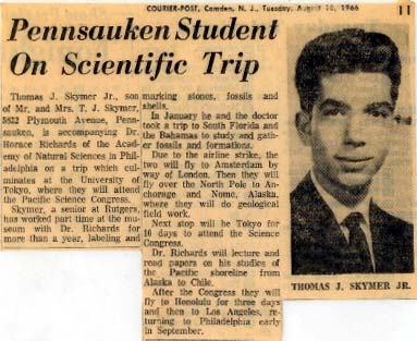 Courier-Post April 10, 1966 Thomas J. Skymer Jr. This is my brother, and a newspaper article on his scientific trip with Dr. Horace Richards of the Academy of Natural Sciences. There is a web site on Dr. Richards and a book that was written on this trip that mentions my brother. My brother had a extensive collections of rocks and minerals of museum quality. Jo Ann Skymer Hirsch |