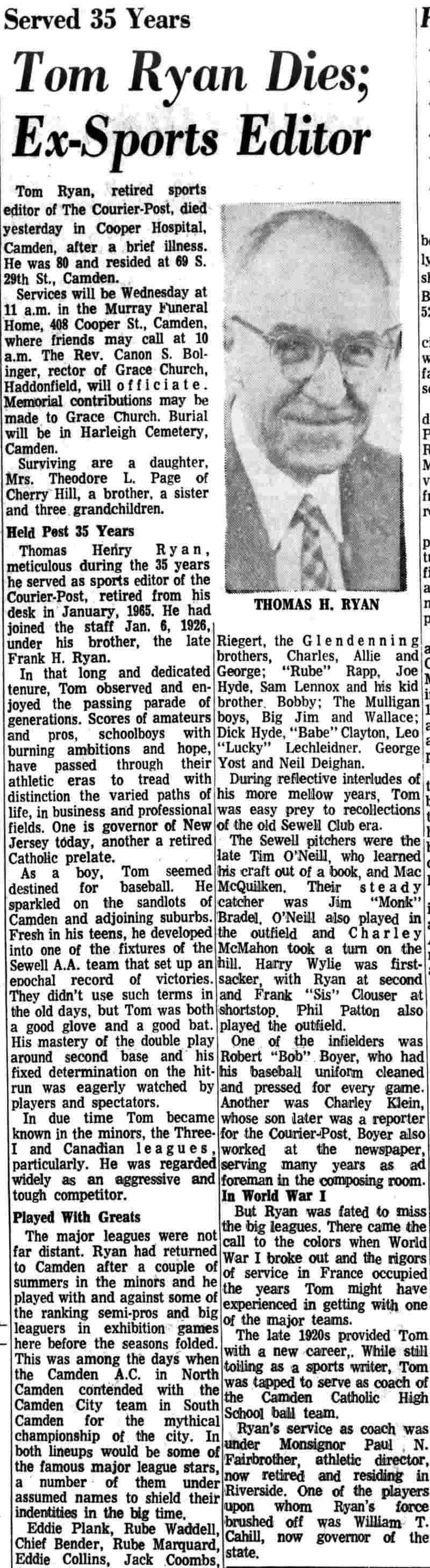 “You may state definitely that Camden will not enter the proposed North-South Baseball League this year.” That is Lou Schaub’s answer to the query as to just what he intended doing in the matter of accepting a franchise in a new Class B circuit in which Camden had been extended an invitation to join, together with Trenton, Jersey City, Allentown, Easton, Norfolk, and Richmond. “I wired Judge William H. Bramham, one of the organism of the league, last night that Camden would not enter the circuit under any circumstances. The fact that Jersey City cannot be represented in the league is the reason for Camden not taking a franchise, yet there were several other angles, mostly financial, which did not appeal to the local club owners,” continued Schaub. When the St. Louis Cardinals recently bought the Rochester Club; of the International League, and in turn transferred the Syracuse Club to Jersey City, that decided our stand in the matter. Without Jersey City in the league, the proposition doesn’t look good to us. Jersey City Would have “Made League” “The circuit which was proposed at the only meeting I attended was one that I thought should prove a success. The cities suggested and which were represented at that meeting included Trenton, Allentown,1 Jersey City, Easton, Camden, Norfolk and Richmond. Of course, the league organizers were in favor of * six-club circuit and as Easton, so far as I could understand, had no ball park, it was the thought that the other six clubs represented would form the circuit. “Jersey City, represented by Dick Breen, was not free to enter the circuit at that time due to territorial rights owned by the International League, but it was thought that that matter could be adjusted without any undue difficulty, the club having been out of that circuit for the past two years. Breen was one of the most enthusiastic prospective club owners present and inferred that he would have little trouble in interesting enough capital to purchase a franchise providing the International League would void its territorial rights to Jersey City. Would Have Cost $10,000 to Enter Circuit “We fully intended to enter the circuit if Jersey City, Trenton, Allentown, Richmond and Norfolk comprised the circuit even though it would cost us in the neighborhood of $10,000 to even open the park for league ball. However, the failure to secure Jersey City, doesn’t warrant our spending any considerable sum of money despite the fact that the organizers notified me to the effect that they were willing to cut down the good faith guarantee from $3,000 to $2,000, and the time limit from five years to one year as was originally proposed at the meeting I attended. “In fact, only making the clubs post a thousand dollars for one year was worse than the original plan. Suppose we went to the expense of improving Public Service Park, upon which we hold a three-year lease, which is far from iron clad, as it states that the company has the right to use it at the close of any baseball season for whatever purposes they desire, and that Public Service decided to use the park at the close of the present year, or that the league ‘blew’ in mid-year. We’d be out of luck, and how. “Our good faith guarantee of $2,000 would be returned to us in event the league ‘blew,’ but that would be just a drop in the bucket compared to the amount of money that would have to be expended in refitting the park and obtaining ball players. And I don’t like the looks of the circuit without Jersey City in it. Would Have Taken Chance With Jersey City “Then again, if the Public Service Corporation decided to utilize the park for any purpose after this year we’d be in a worse jam even though the league went through. But, we would have taken both chances if Jersey City had been included in the league as we felt that it was one of the clubs which would have given the league a sound footing and which would have been a main factor in making it a success. “Of course, that is mere supposition on our part, but the position we are in now hardly call, for the club owners to invest dose to $10,000 in getting a franchise in a new league. Will Run Same Sort of Club This Year as Last Year “Besides the expense of improving the local park, we would have been forced to spend considerable money to obtain players. Although some players might be awarded Camden from the Virginia League Club whose franchise we would have been granted, there was little likelihood of there being any worthwhile material go with the franchise. Therefore, in order to compete with the other clubs we would have been compelled to either buy or at least give a signing bonus to players who would have been useful to the club. “No, it isn’t worth the chance and you may inform the public that we’re not going in the league. If Jersey City had been included in the league, we were ready to invest the money, but the circuit as it now stands, often no inducements for us to join, but you can also inform the fans that we will be in the field with another good independent club this year,” were Schaub’s parting words. “Barney” Tracy on Way Home Here’s more baseball news which will interest quite a number of local fans. Received a letter from Harry “Barney” Tracy, who has been playing winter baseball with Tony Pasquerella’s Crisfield Club in Porto Rico for the past two months. The “redhead” writes that he will be home almost any day now as he arid the other members of the club sailed for South America on January 16. “Barney” informs us he has seen all there is to see of Porto Rico and then some. The club played from one end of the island to the other and if they missed a town it was because that town didn’t have a ball orchard. They played most of their exhibition games opposed to the Ponce Club, which included San, of the Cuban Stars, and Daviu, former1y of Allentown, but who is now the property of the Binghamton Club, of the 