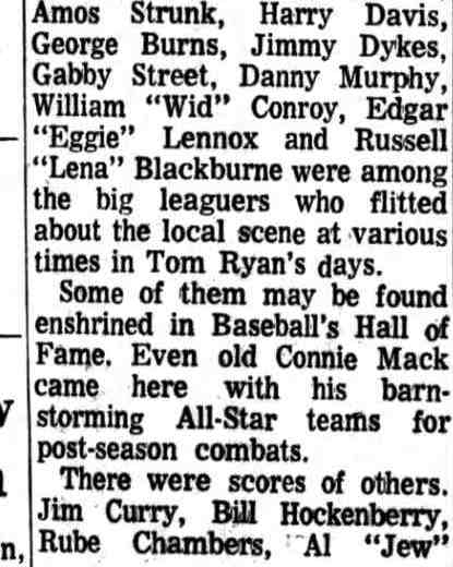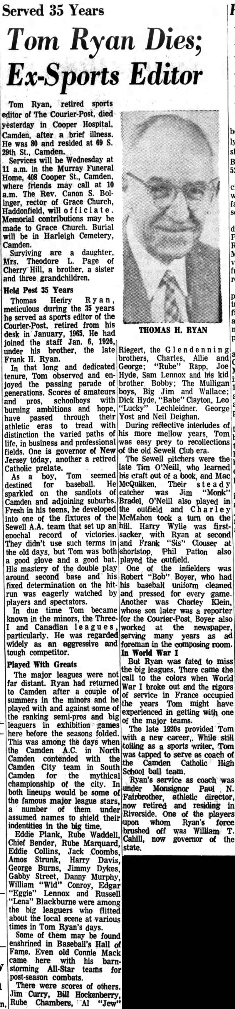 AND DOYLE CAN MAKE OR BREAK LENNOX By TOM RYAN “Wouldn’t it be a big boost for Eggie Lennox if Roy Sherrid and Johnny “Lefty” Doyle both show enough stuff to become regular members of the New York Yankees’ pitching staff this year?” That’s the remark which was pined by a rabid baseball fan today when it was reported that the Yanks are combing the country for a brace of southpaw flingers, but, in a pinch, will split their needs and take one left-hander and another tuner who heaves the right way. The Yanks are sadly in need of another southpaw. Herb Pennock is the only unorthodox flinger remaining on the Yanks’ payroll, “Dutch” Reuther and Joe Giard having passed on to other fields. However, what interested the local “bug” is the fact that Lennox recommended both Sherrid and Doyle as pitching prospects to the Yankees’ management and that both flingers are almost certain to accompany the club on its spring training trip. Both Hurlers Well Known Here Although Sherrid and Doyle are not local pitching products, South Jersey fans are as highly interested in their welfare as if they belonged in this section. Sherrid’s home is in Norristown, while Doyle is a resident of Philadelphia, but owing to the fact that Sherrid hurled for Lou Schaub’s Camden Club and Ocean City, and that Doyle pitched for both Clementon and Gibbsboro in the County League, they have every fan in this area pulling for them to make the grade. “If Sherrid and Doyle should both be retained by the Yankees, Lennox’s ability in selecting prospective big league pitchers should entitle him to grab off a scouting job with the Yankees, for that’s what they appear to be in need of for the next few years more than any other players,” continued the fan. “At that, the Yankees’ management must think well of’ Lennox’s judgment when they tendered both youngsters a con-tract on his recommendation. “And it wouldn’t be surprising if both Sherrid anti Doyle exhibit enough ‘stuff’ on the training trip to stick, as I have seen them in action and believe they have the ability to land a job in the ‘big show’,” said the fan in bringing his oration to a close. Sherrid’s Start Like Fairy Tale The “booster’s” views are shared by hundreds of other South Jersey fans who have seen both curvers display their pitching prowess, and who are expecting great things from Sherrid and Doyle in the near future.Sherrid’s start in first class independent baseball reads like a tale from the Arabian nights. In mid-season of 1921, Schaub’s pitching corps was badly in need of bolstering and the Camden pilot was willing to go the limit to obtain an effective flinger, but could, not land one who could turn in victories with any consistcncy until Sherrid bobbed up on the horizon. Here’s how it all happened. Walter “Reds” Harris, now resident of Norristown, but who is well known to older baseball fans here, having played with Camden A. C., X.X.V., and several other semi-pro clubs in Camden, had been touting Sherrid to Schaub, and though the latter thought Sherrid was a “bloomer” like several dozen other flingers who had been boosted to him earlier in the season, he was in such a bad way for pitchers that he told Harris to bring Sherrid to Catasauqua and that he’d. look him over at least. Works Two Days Hard Running Harris, who had plugged Sherrid’s wares to Schaub for several weeks, was tickled to death with the proposal and towed his find up to Catasauqua the day Camden was due to tackle the “Catties.” Schaub liked Sherrid’s looks and wanted him to work that day, but was skeptical about starting him as the kid admitted he had worked nine innings the night before at Norristown. Nevertheless, he insisted he could go the route again that day and he proved it. The home forces only got three blows and as a result of Sherrid’s airtight flinging, Camden won 3 to 1. After that exhibition, Sherrid, who was then pitching under the name of Richards, owing to the fact that he still was attending college, became a regular member of the Camden hurling staff. He won six straight for the locals before joining Ocean City, where he continued his great work, winning 12 out of the 14 games in which he participated. However, before leaving Camden, Sherrid signed an agreement to play with the Yankees. Lennox, sensing a great curver in Sherrid, wrote Eddie Holly, who was then an Ivory hunter for the Yankees, just what a great prospect Sherrid appeared to be and after looking him over once, Holly immediately offered him a contract upon which Sherrid placed his signature without the slightest hesitation. Is Student at Albright College The burly hurler returned to school that fall and rejoined Camden last spring. He only worked two or three games here before he was sent to York, of the New York-Penn League, by the Yankees. He was well up among the leading hurlers at the close of the race in that circuit and his showing evidently made an impression on Miller Huggins for Sherrid’s name appears on the list of the players who are expected to accompany the club on its spring training trip. Sherrid still is attending Albright College, but is expected to grad-uate shortly. However, even though he does not obtain his sheepskin by the time the Yanks start south he more than likely will foreswear his de-gree and accompany the club when he gets the call to report. From Clementon to Yanks in Two Leaps Doyle, while not as tall or as heavy as Sherrid, is one of the sweetest little left-handers ever to toe a slab. He first broke into the limelight in this section when he accepted an offer to hurl for Clementon, of the Camden County League, in the spring of 1926. Johnny was a success from the start and it wasn’t long before every club in the circuit was “leery” of facing his southpaw slants. But, he didn’t linger long with the “Clams.” Offered better inducements by several other clubs in the league, he broache