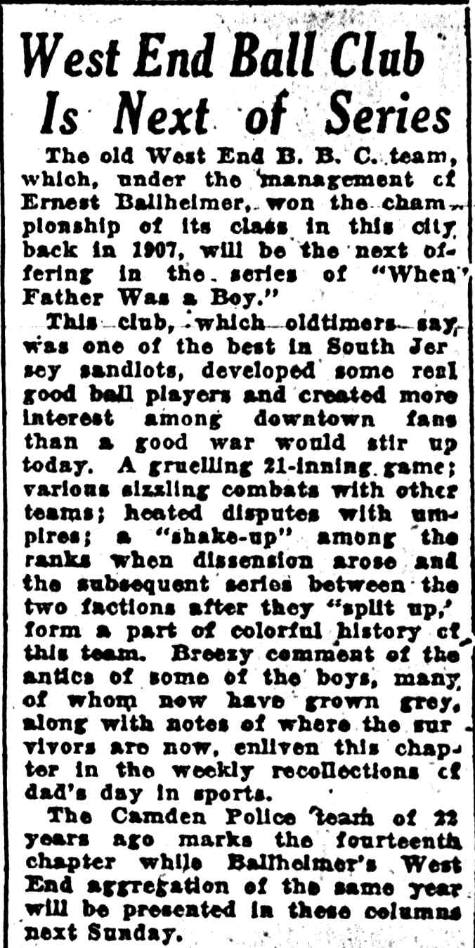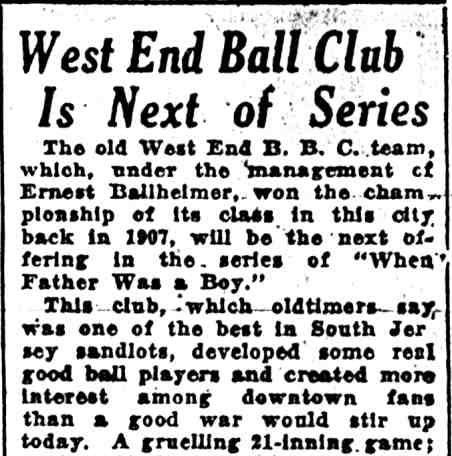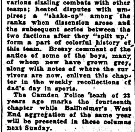 Camden was a baseball town as early as the 1860s… and probably before that, although the game as it was played in those times was quite a bt different that played today. That there were very good players in the city even then is beyond dispute, for the very first run scored in a major league baseball game was scored by Camden's Wes Fisler, the first basemen of the Philadelphia team in the old National Association. A number of other Camden men who got there start playing in the 1880s went on to the majors including Charles Alcott and Kid Gleason, and more would follow in the decades that followed. To say that Camden had thriving semi-pro baseball scene into the 1940s would be an understatement of large proportions. After World War II the baseball scene in Camden ebbed, for a number of reasons, a few of which included the post World War II draft that took young men out of the city, the economic collapse that took potential team sponsors out of the city, and television… no longer did one hve to go TO the game to witness the game. The Golden Age of Baseball in Camden came to an end… but believe you me, when it was good, it was VERY, VERY good. In 1929 The Camden Courier-Post newspapers ran a series of articles on teams of the 1900s. This page will present as many of these articles, as they become availabe. |