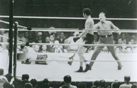 Baer jabbed Schmeling twice in the face. Baer's round. - Round Three Schmeling came out cautiously. Baer let go one that looked a little low to Donovan and he cautioned the Californian. They danced around. Schmeling came in close and pounded the Californian's body. Baer missed a long right by a foot and the crowd laughed. Baer, however, followed this miss right up with a hard right to the pit of the stomach. Schmeling shoved Baer into a corner and landed a right to the heart. They milled about in close, both pounding the body. Baer stepped out of a clinch and chopped a hard left and right to the chin. Schmeling seemed durable and took them without backing up. They were slugging in the middle of the ring at the bell. Baer's round, Round Four Baer popped a left into the German's face, Schmeling danced around cautiously, circling to Baer's left. Baer threw in four or five lefts and rights to the face and body. Baer almost pushed Schmeling off his balance and made a gesture of shaking hands in apology. Schmeling poked two lefts to the face followed by a right cross. Baer took them without any seeming annoyance. Schmeling drove a hard right to the jaw. Baer missed a right to the chin. They clinched. They exchanged light lefts to the head. Schmeling buried his head on Baer's shoulders and pounded his opponent's body. They were fighting toe to toe at the bell, Round even. Round Five They rushed into a clinch. They exchanged left jabs to the face, Schmeling pushed his opponent against the ropes and pounded the body with rights. Baer seemed to be taking it easy at this stage. Suddenly Baer opened up and landed two good lefts and a right to the head. Schmeling threw two hard rights which landed on Baer's left ear. The Californian grinned. Baer sank a hard left to the stomach and followed it with three rights to the head. Schmeling caught Baer with a sharp left to the chin. He backed Baer up against the rope and pounded his body. Baer threw a hard right against the German's chin, but Schmeling kept boring in. Schmeling put his head on Baer's neck and pushed his opponent's body. At the bell Baer landed a hard left to the chin. Schmeling's Round Round Six Schmeling landed a light left to the face. Baer countered with three straight lefts, none of the three hurting Schmeling. Schmeling drove Baer into a corner and they pummeled each other in the body. Baer landed a left and then another left to Schmeling's jaw without a return. They clinched. Coming out of the clinch, Baer landed a right to the jaw which sent Schmeling against the ropes. As the German rebounded Baer caught him with a terrific right which shook Schmeling to his heels. Baer poked Schmeling in the face with several lefts. Baer landed a blow in the pit of the stomach which looked low to Referee Donovan. The crowd booed Donovan when he warned Baer. They were in a clinch at the bell. Baer's round. Round Seven They came out cautiously. Both landed hard rights to the head. Baer poked a long left into the German's face. Schmeling pushed Baer against the ropes and belabored his body. Baer sank a hard right into the stomach. They circled around the ring. Schmeling backed Baer into a corner again and shot several hard rights to the heart. Baer backed away as Schmeling threw several authoritative lefts to the body. Schmeling landed a left and right to the head. Baer missed a hard right to the head, almost swinging himself off his feet. Schmeling's round. Round Eight Baer threw a left into the stomach. Baer held his left shoulder high as Schmeling swung several rights to the jaw. Baer landed a solid left hook to the body. They clinched. They pounded each other in close. Baer got Schmeling on the ropes and clouted him with two rights to the head, They clinched. Coming out of the clinch, Schmeling landed a left hook to Baer's chin. Baer grazed Schmeling's chin with a right which he threw from the floor. Baer held out his long left teasingly and smiled as he poked Schmeling several times. The swarthy Teuton however did not return the smile, but kept plugging away. 'They roughed each other about a bit at the bell and the crowd booed. Round even. Round Nine Baer poked two lefts to the face. Schmeling did the same thing. Baer missed a right which he telegraphed. He tried again and this time landed right on the button. Schmeling did not like it. Baer rushed Schmeling to the ropes and smacked him several hard rights to the head. Joe Jacob's, Schmeling's manager, began to yell from his corner. Schmeling stopped and turned around. This caused Jacobs to cry, "watch him." Schmeling went into a clinch. Baer pushed the German away and sank a left to the body and followed it with two lefts and two rights to the head. Schmeling crossed a right to Baer's chin but the Californian did not seem to mind it. Baer pushed Schmeling against the ropes again and landed several rights to the head as the bell rang. Baer delivered a backhanded slap just as the bell rang and Schmeling countered with a vicious right. They threw several more punches after the bell rang and the crowd went wild. Baer's round Round Ten Baer rushed out like a madman and threw lefts and rights to the German's head. Schmeling held. They circled about. Schmeling sent a vicious left to Baer's nose which drew blood. Baer threw five successive rights to Schmeling's head and had him groggy against the ropes. Baer floored Schmeling coming out of a clinch Baer floored Schmeling with a right to the chin. Schmeling down. Schmeling came up after a count of seven and Baer rushed out slugging with lefts and rights. The German was out on his feet and Referee Arthur Donovan stopped the fight, awarding the fight to the Californian, Max Baer. |
