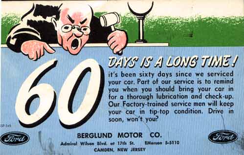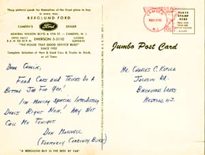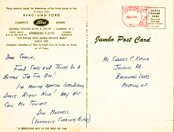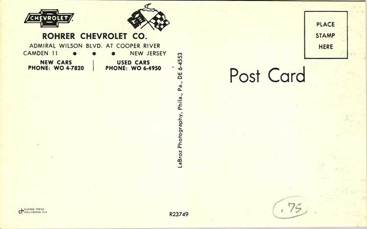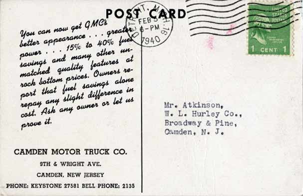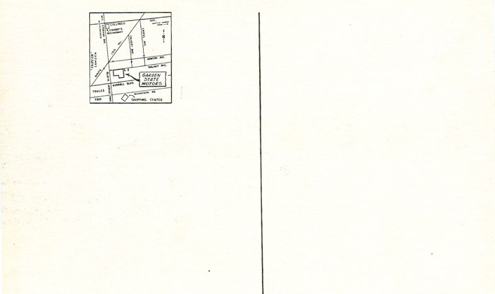 State Motors Until early 1960s at Federal & E. State Street This card is new home on Black Horse Pike Rear of Card |