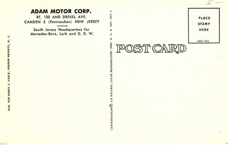 Motors Mercedes Benz-Studebaker Late 1950s-1960s Route 130 & Drexel Avenue, Pennsauken Rear of Card |