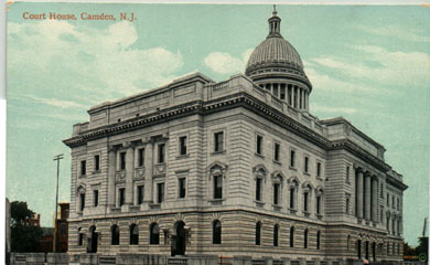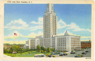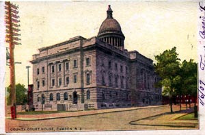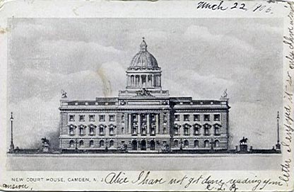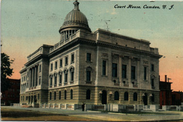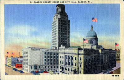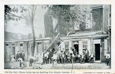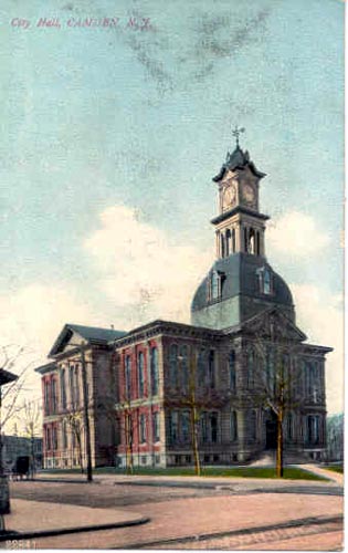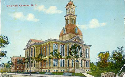 FIRST City Hall "Where Public Service Building Now Stands" This Civil War era photograph was republished as a post card by the Munger & Long Department Store (southwest corner of Broadway & Federal Street) sometime between 1903 and 1926. The Public Service Building, which still stands, has housed the Camden Free Public Library since the 1980s. |