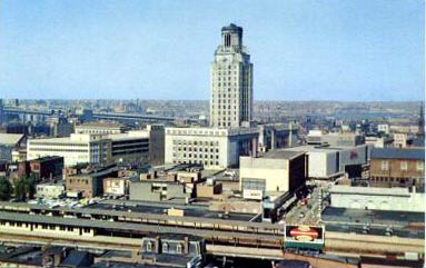 Looking West from 6th Tall building on right side of street is the Temple Theater |