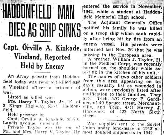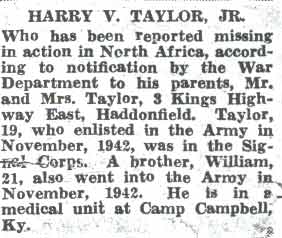 PRIVATE HARRY V. TAYLOR JR. was born in 1924 to Harry and Florence Taylor. He was the third child, coming after Mary and William. In 1930 the family was renting a home at 209 White Horse Pike in Haddon Heights NJ, and the elder Taylor was working as a clerk for the Pennsylvania Railroad. They later moved to 3 Kings Highway East in Haddonfield NJ. Harry V. Taylor enlisted in the Army in November 1942 while still a student at Haddonfield Memorial High School. He was assigned, along with several other men from South Jersey, to the 31st Signal Construction Battalion. After receiving training at Fort Atterbury IN, his unit was sent overseas, with their final destination to be India by way of the Suez Canal. The trip to North Africa was uneventful. His unit transferred to another ship, the HMT Rohna, at Oran, Algeria. On November 26, 1943 the Rohna came under attack from German Luftwaffe aircraft. The Rohna was struck by a guided missile, and sank. 1015 American servicemen were lost, among them Private Harry V. Taylor. Harry Taylor was survived by his parents, brother William Taylor, and sister Mary Taylor. William Taylor was at the time serving in the Army Medical Corps. Circumstance relating to the death of Harry Taylor and the others lost when the Rohna sank were kept from the families and the American public for over 50 years. Due to a campaign by the Rohna Survivors Memorial Association, the government finally acknowledged these men in the late 1990s. Through the efforts of this website and American Legion Post 274 in Camden NJ, a memorial service was held on July 27, 2002 for Harry Taylor and the 19 other men form South Jersey who paid the ultimate price for our freedom in November of 1943. |