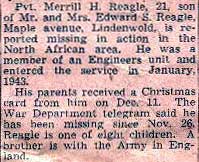 sports teams. On the November 26th, 1943 Merl Reagle and the 853rd Engineer Battalion, Aviation sailed out of Oran, Algeria on the British owned and operated transport ship, HMTS Rohna . Later that day, the convoy that the Rohna was a part of was attacked by German aircraft. After initially beating of the attack, another German plane approached the convoy, and launched a new weapon, a radio-controlled glider bomb, in essence, the worlds first guided missile. The Rohna was struck by the missile, which blew a hole through both sides of the ship, killing 300 Americans immediately, many of the members of the 853rd Engineers. Merl Reagle most likely met his fate there. The ship quickly sunk, and over 1000 Americans were lost that in the ensuing hours. The sinking of the Rohna was kept secret from the public during the war, for reasons of wartime security. Sadly, the government waited over 50 years before declassifying the story, and the families of those lost on the Rohna were never told the truth of their loved ones fate. Only in the 1990s, due to efforts of survivors of the sinking, was any official acknowledgement made. |