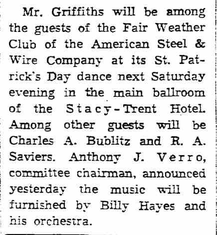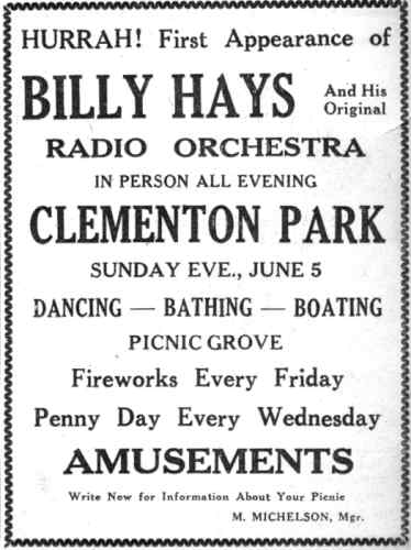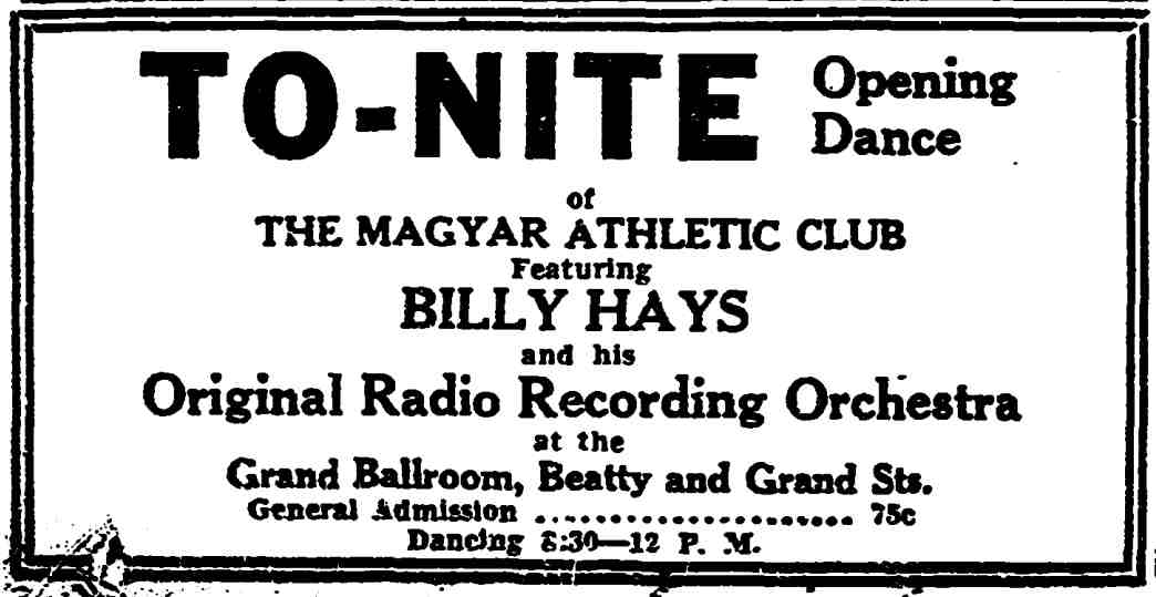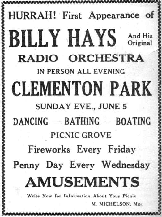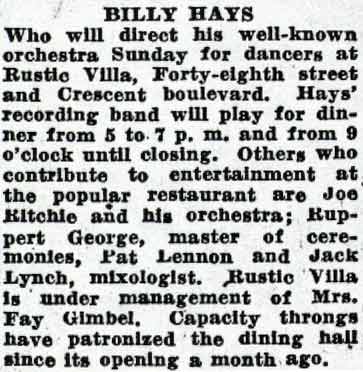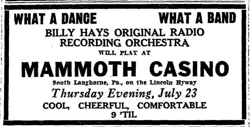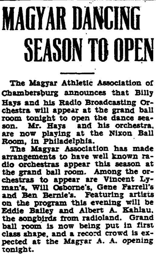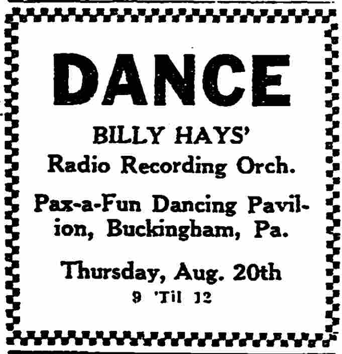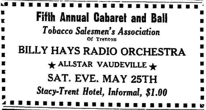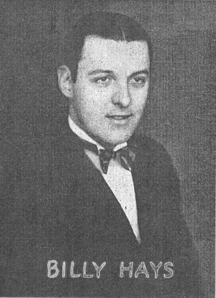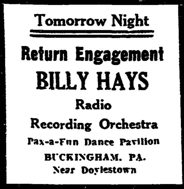 Billy Hays played in and led bands in South Jersey and Philadelphia from the 1920s through at least the mid-1960s. He was quite popular both for his live work in clubs, he was quite well known in the Philadelphia area as a radio artist, appearing on radio as early as 1924. Born William S. Hays in Philadelphia in June of 1898 or 1899, he was the son of William Frederick Hays and the former Katherine "Katie" Kerns. An only child, he grew up in Philadelphia and resided there through at least 1940. The 1900 Census shows the family at 2550 North Jessup Street, and states that his father worked as a wallpaper maker. The elder Hays was still following this profession on 1910. The family by then had moved to 1104 Nevada Street. It is not known as of this writing exactly when Billy Hays got involved with music or what his training was. At the age of 18 he married Hilda Stevens, who was, according to the 1940 census, 15 at the time. A son, Elwood W. Hayes, was born on August 18, 1918 in Philadelphia. The 1920 Census shows Billy Hayes and his family living with his parents at 1116 Nevada Street in Philadelphia. He was then working as a driver for a laundry. This was not where he would seek his fortune, however. By the mid-1920s he was leading his own band and was appearing on radio in Philadelphia. Available newspaper listings show Billy Hays on radio in 1925, and he may have been on air before that. He soon had had his own program, and was a fixture on local stations into the mid-1930s. His programs were also picked up by out of town stations in Albany, New York and in Massachusetts in the 1930s. Billy Hays' popularity brought him to the attention of the record companies. He recorded ten songs for the Victor label in Camden in 1929, and a few sides for the Okeh label in 1928 and 1929. Years later he recorded two sides for the Top Tunes label. He also was active as a songwriter and composer, and when not involved in actually writing a a particular song, was credited on the published sheet music as its performer. This was the case for "Let's Forgive and Forget and Start Over Again", written by Max C. Freedman and Camden, New Jersey's Don Travaline and published in 1926. There is a certain amount of confusion concerning Billy Hays' recordings for Okeh, as Sam Lanin, a prolific bandleader of the era, also recorded for Okeh and Regal as "Billy Hays", and most Internet sources credit Lanin with the Okeh recordings. However, at least one record collector who knew Hays and had heard his bands many times over the years credits a few of the Okeh tunes to Hays and his group, who co-wrote them. Billy Hays got his start with Charlie Kerr, who was one of the first big bandleaders in Philadelphia. Jack Montez of Atlantic City, New Jersey, writing for RECORD RESEARCH magazine in the 1964, gave the following information about Hays: Billy Hays, drummer, vocalist and composer, headed one of the better Chinese restaurant- type bands around Philly in the 20's. They featured slow tunes with schmaltzy vocals, liberally laced with temple blocks, but could kick off with some pretty good jazz when things were right. This band cut a few sides for Victor and Okeh, the Okeh's being far better, and featuring some [Adrian] Rollini style bass sax. In the 30's Billy went on a small band Dixie kick, and took the group to Wildwood, N.J. where he played for many summers. He is currently playing the Beef'n Bourbon, back in Philly. I have heard MARIANETTE, MY MIAMI MOON, and SWEETHEART LANE, and they certainly have all the ear marks of the group that Billy had at the Cathay Tea Garden, and later on at the Golden Dragon in Philadelphia, and I knew that band pretty well. The above tunes were Hays or sidemen compositions, and Billy's voice is unmistakable. I have SUGAR & ME/ VIRGINIA ROSE Vi. V-40056 and PRETTY FACE/ALL BY YOURSELF Okeh 41193, and these are definitely the band referred to above. The Top Tune 467/468 was recorded much later with a small Dixie combo that he organized when the big band broke up. CAKEWALK/TIN ROOF were recorded when he was playing in Wildwood, N.J. The excellent trombone on these sides is Mark Pascoe, who plays the pit at the Globe Theatre here during the summer season. Regarding the tune MY MIAMI MOON: the band ran a radio contest to get lyrics for the melody - they had a remote from the Cathay. Billy Hays' Orchestra was made up of well-known studio musicians such as Mike Mosiello and Andy Sanella. As indicated above, some sources take the band's name as a pseudonym for Sam Lanin, while others consider it to be one of dozens of Harry Reser's aliases. The band's original photo, however, prove Billy Hays was a real person and his band was a real band. This shot, made in 1929 at the first session of Billy Hays' Orchestra for Victor Records, was presented the band. On the photo he is pictured fifth from left, next to the banjo player. Hays is second from left. The photo above and that below, were made in 1929 at the first session of Billy Hays' Orchestra for Victor Records. They were presented to Glen Richards (the administrator of Hot Dance & Vintage Jazz Pages) by Samuel M. Zehel, whose grandfather, Joe B. Smith, was the lead alto player in the band. On the first photo he is pictured fifth from left, next to the banjo player. Hays is second from left. The original photo clearly shows the vocalist, Andrew T. Stanton, holding a sheet music copy of 'Sweet Virginia Rose', which they recorded on this date. Other musicians that appeared in the Victor sessions included Chuck Campbell, Sam Feinsmith, Phil Napoleon, Joe B. Smith, Sam Freed, Carson Robison, and Roy Smeck. Outside of the recording studio, Billy Hays' live career spanned five decades. He played in Wildwood for years, and is known o have appeared at Lou Booth's club in the 1940s. February of 1950 saw him booked at Chubby's on Mount Ephraim Avenue, and, as Jack Montez wrote, Billy Hays was back in Philadelphia in the mid-1960s. Another Hays researcher was 
