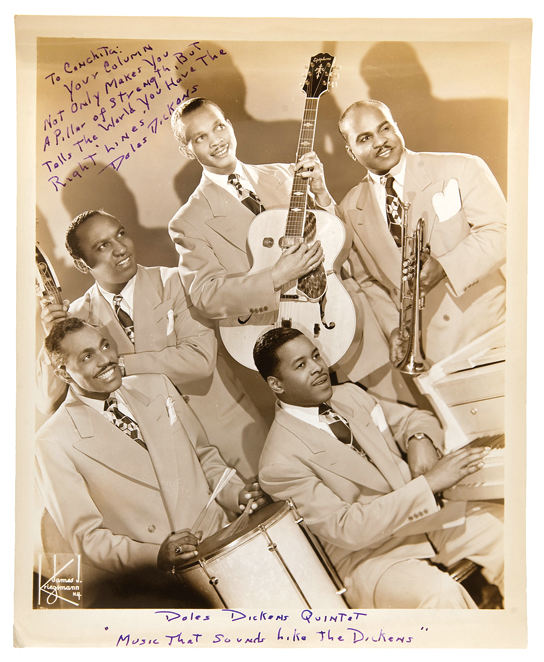 DOLES DICKENS began his recording career in 1940, on bass, with the Eddie South Orchestra. He left them in mid-1943, when he joined The Five Red Caps. He cut a few records with them for Beacon and stayed on with them until 1946, when he went on his own. He waxed for Superdisc, Continental and Gotham in the mid-40's with his own jazz quartet, featuring Herbie Scott, Reuben Cole and Dickie Thompson, then moved to New York in 1949 to record for Decca. There, in 1949, he recorded "We're Gonna Rock This Morning," and covered Wild Bill Moore's "Rock and Roll," which Moore had cut the year before. At the same time, he played bass in sessions for Piano Red. He recorded in 1954 as Doles Dickens and the Strangers, and made records at least into the soul years of the mid-60's, acting as musical director. In 1964 he became a studio session man for the Gotham label, backing up some pop singers. |