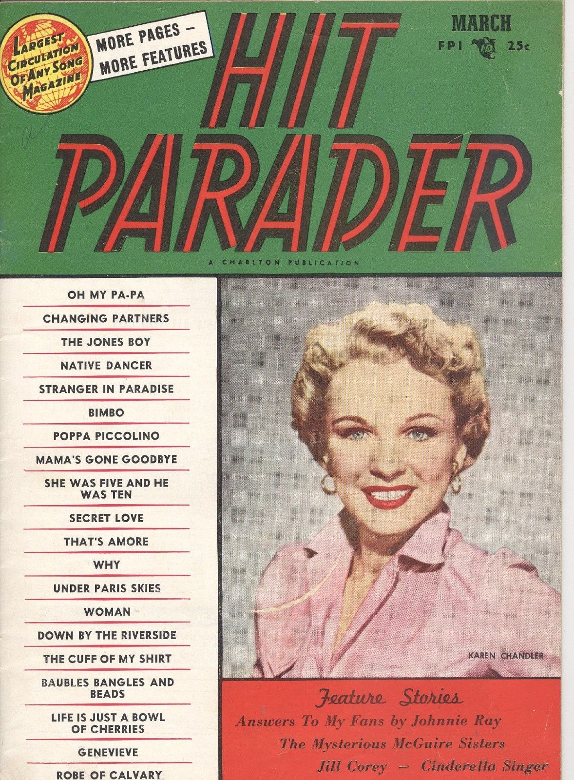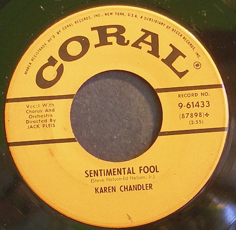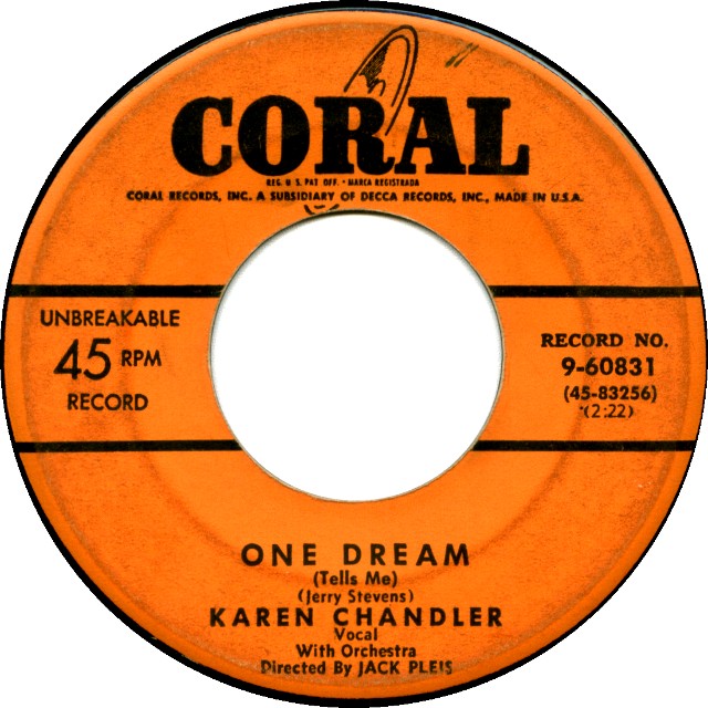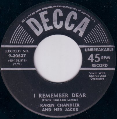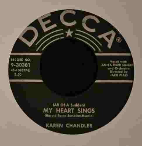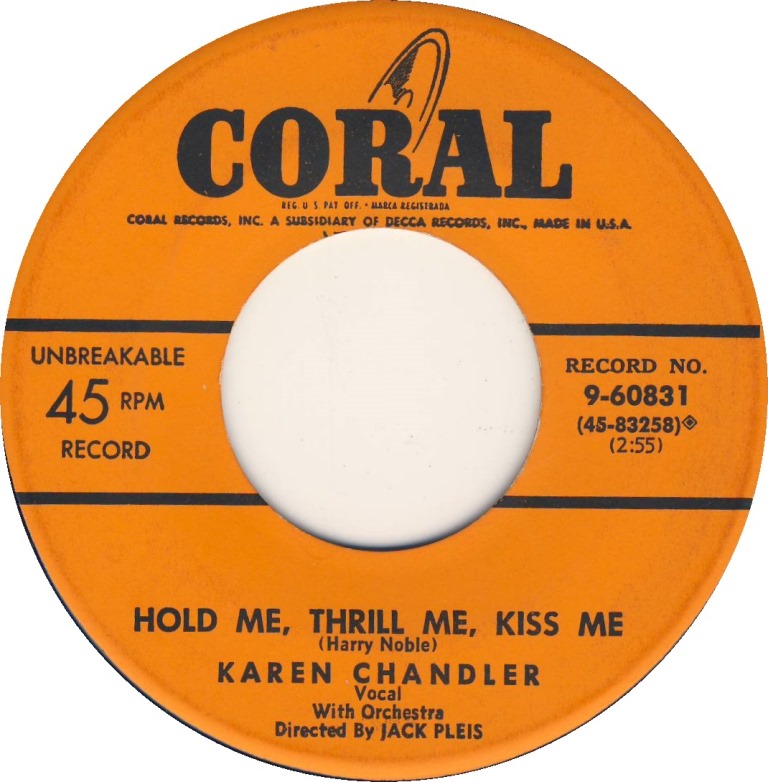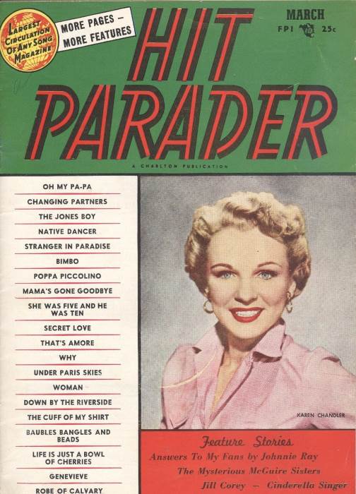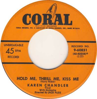 Karen Chandler was born in Rexburg, Idaho, and got her first big exposure in music while she was at Brigham Young University. She first received recognition under the name Eve Young with the Benny Goodman Orchestra. Her first appearance was on July 8, 1946 on a Goodman radio show singing "I Don't Know Why". On subsequent radio broadcasts, Eve Young continued to perform vocals with the entire band and the Goodman sextet. Her first appearance on record was on August 7 of that year singing "For You, For Me, For Evermore" on Columbia #36736. The flip side was "A Kiss In The Night" with vocal by Art Lund. She continued doing radio with Goodman such as "Magic Carpet Ride" for the Armed Forces Radio Service, and did an un-issued test pressing of the tune "That's The Beginning Of The End" on October 15. On October 22 of 1946 Eve Young did the vocals on both sides of Columbia #37207 - "Man Here Plays Fine Piano" and "A Gal In Calico". Continuing with regular programs and "One Night Stand" broadcasts for the AFRS during the rest of the year. By New Years day 1947, Eve Young had been replaced in the Benny Goodman band by Jeanne McKeon. In late 1947 Eve Young was signed to RCA Victor Records, but it wasn't until late on in the year 1948 that she finally found some success. It came with a bit of musical nonsense from the 1948 film "A Date With Judy" which starred Elizabeth Taylor and Jane Powell. Carmen Miranda and Xavier Cugat's Orch. did the tune "Cuanto La Gusta" which Eve Young recorded with The Drugstore Cowboys on RCA #3077. The record made the best sellers list in the top 30, and was followed by "My Darling My Darling" on #3187 on a duet with one of the Drugstore Cowboys from the previous release named Jack Lathrop. The song from the Broadway show "Where's Charley?" did a bit better than her previous release for RCA. Further RCA releases by Young included "Laughing Boy" / "I Can't Think Of A Thing To Do" on #3335, and "It's Me" and "Cabaret" on #3412 did not sell and so Eve Young was let go by RCA and faded from view. Fast forward to the year of 1952, and Eve Young had re-invented herself with a new name - Karen Chandler, a new record label - Coral Records, and a new husband - Jack Pleis, who was also the main arranger and conductor for the Coral label. As legend has it, she was heard by Jerry Lewis doing an audition for a television show, and was steered to Coral. The first recording by this new team turned out to be one to remember. "Hold Me, Thrill Me, Kiss Me" on Coral #60831 (the flip side was "One Dream") was an immediate hit and soon spread across the country as a top seller. During late 1952 and early 1953, the record was a mainstay on the best seller charts for over five months, sold a million copies, and reached number 5 in the country. This huge hit was followed by a forgettable effort in "I Hear The Music Now" and "The Old Sewing Machine" on #60911, but in the spring of 1953 "Goodbye Charlie, Goodbye" on #60958 (the flip was "I'd Love To Fall Asleep") which reached into the top 30 best sellers. For the rest of the year of 1953 however, Karen Chandler came up empty. "Rosebud" / "I Wouldn't Want It Any Other Way" on #60995, and "Transfer" and "Madonna" on Coral #61034, were both non sellers. "Why?" on #61088 with "Flash In The Blue" got into the top 25 in early 1954. Following this release, "Positively No Dancing" and "Hit The Target" on #61137, and "Why Didn't You Tell Me?" and "Out In The Middle Of The Night" on #61181, both were unsuccessful. Soon the rock years were about us and Karen Chandler had experienced her day in the spotlight of the pop music world of post war America. |