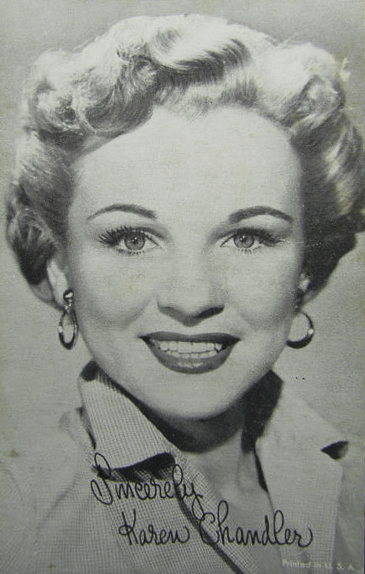 One of the things I enjoy most about digging into music history is the way the process sometimes leads me into unexplored territory. The latest example occurred while I was putting together a recent piece about pop star Mel Carter and ran across another singer, a mysterious lady who'd also had a best-selling record of Mel's big hit, "Hold Me, Thrill Me, Kiss Me," but a dozen years earlier. At that time the singer was known as Karen Chandler, but she had performed earlier in her career as Eve Young, and was actually born Eva Nadauld. Although her birth date is unknown, she was a native of Idaho who attended Brigham Young University, which might have helped her pick her first stage name. In any case, by the time she made her first documented professional appearance — singing with Benny Goodman's band on a 1946 radio show — Miss Nadauld was calling herself Eve Young. Over the next several years Eve Young continued to make a name for herself, first by making more appearances with Goodman and later by working her way into early TV, gaining spots on variety shows like Musical Merry-Go-Round. She also managed to land a recording contract, which led to several successful records, among them "For You, for Me, for Evermore," and "Cuanto la Gusta." At some point along the way she'd also married arranger Jack Pleis, although the date is uncertain. By 1950, Eve Young's recording contract had expired and she was beginning to cool off a little, but she still continued to show up in key spots from time to time. One of her best was a spotlighted turn on TV's Martin and Lewis Colgate Comedy Hour. (You can see her in the video below if you wait out Jerry's long introduction). In 1952 Eve Young decided to completely reinvent herself. She lightened her hair, changed her name to Karen Chandler, and managed to land a new recording contract. Her debut recording for Coral Records, "Hold Me, Thrill Me, Kiss Me" (clip), rose up the charts into the Top Ten and became her biggest seller. It was followed by other solid successes like "Goodbye Charlie, Goodbye," and "Why?", but overall her record sales began to slip. Trying something a little different, in 1956 she teamed up with country singer Jimmy Wakely on "Tonight You Belong to Me," and the record did well but things pretty much wound down after that. Although she did attempt a brief comeback a few years later, by the late 1960s her career was over and she had disappeared from view.. |