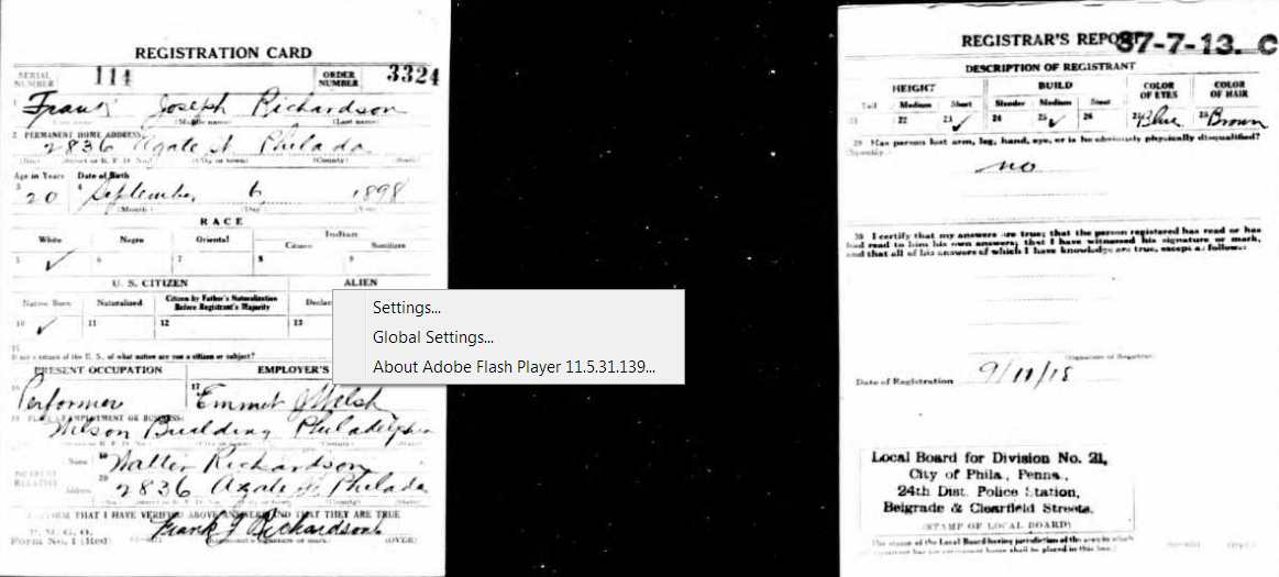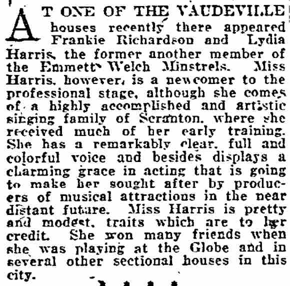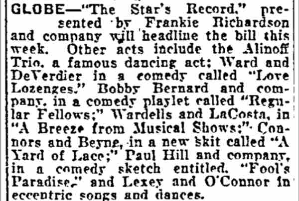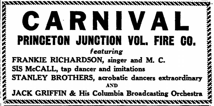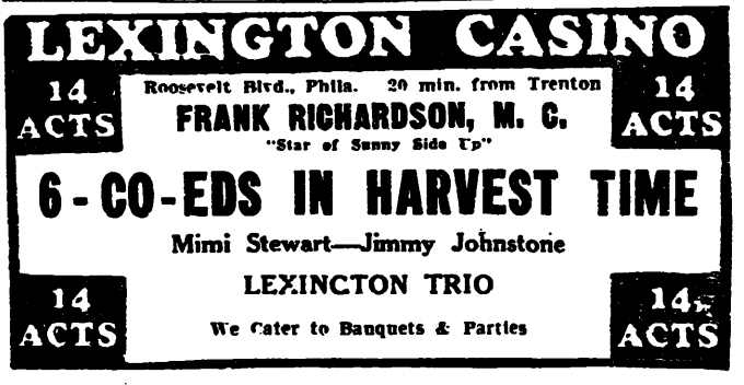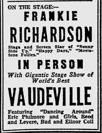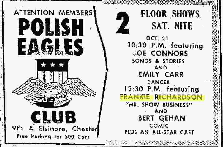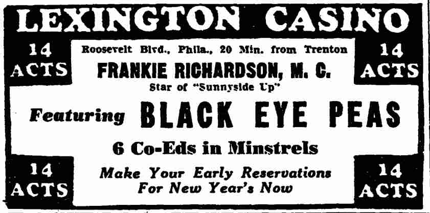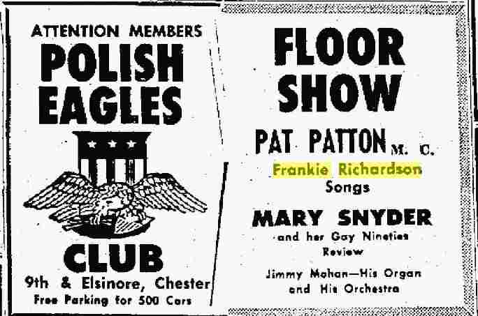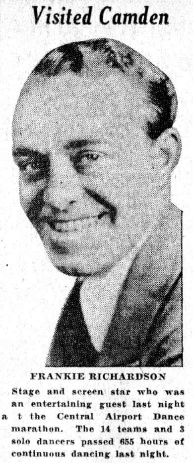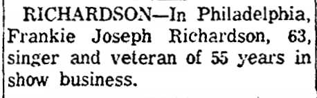 A native of Philadelphia, Frank Richardson's show business career spanned five decades and saw him performing in minstrel shows, vaudeville, on records, in movies, on stage in theaters, on radio, and in nightclubs. Billed as Frank Richardson in at least eight movies made by Fox in 1929 and 1930, and on a 1924 record released on Victor, he also periodically billed as Frankie Richardson in the 1910s and 1920s. After leaving Hollywood and returning to the Philadelphia area, he was billed exclusively as Frankie Richardson, and performed locally as late as December of 1961. He was born Francis Joseph Richardson in Philadelphia on September 6, 1898, according to his draft card, dated September 11, 1918. He was one of 8 children born to Walter and Elizabeth Richardson, only four of whom were still living when the Census was taken in 1910. The Richardsons lived at 1712 North Howe Street in Philadelphia's 19th Ward at the time of the 1900 Census. By 1910 they had moved to 2836 Agate Road in Philadelphia and were still at that address through most of the 1910s. Frank Richardson married Adele Boyer in 1919. The January 1920 Census shows Frank and Adele Richardson living in an apartment at 2037 Spring Garden Street in Philadelphia. This marriage produced no children and the couple divorced in 1933. Attracted to performing at an early age, Frank Richardson found work at the age of 8 with Dumont's Minstrels, billed as "The Wonderboy Tenor". He later found work with Emmet Welch's minstrel show at Atlantic City, quite possibly working with Camden's Joe Hamilton, who also worked with Dumont and Welsh in these years. By the early 1920s he had stepped out on his own, billing himself as "The Joy Boy of Song", and on occasion, where he thought his blackface material would play better, billed himself as "The Ace of Spades". He appeared in theaters on the vaudeville circuit all over the United States all through the 1920s. Frank Richardson recorded three songs for the Victor label. On September 27, 1923 in New York he recorded Carolina Mammy and Bebe , with an unknown pianist accompaniment. While a composer is not noted in Victor's records, this may be the same song that Irving Kaufman recorded with the Ben Selvin Orrchetra as Carolina Mammy . In any event Carolina Mammy and Bebe was never released, and the master is on record as having been destroyed. On October 10, 1924 Richardson recorded an Andrew B. Sterling composition, Ukelele Lou , singing and playing the ukelele himself and joined by Anthony J. Franchini on guitar and Frank Ferera on steel guitar. This recording was released as Victor 19503 on a 10" 78 rpm record, the format of those times. Frank Richardson returned to the studio one more time for Victor, on October 27, 1924 singing the Fred Rose tune Red Hot Henry Brown at the Victor studio in Camden, New Jersey, accompanied by pianist Frank E. Banta, who played on scores of Victor recordings between 1916 and 1929. Three takes were laid down, but the song was never issued on record, and the master was also later destroyed. Red Hot Henry Brown was a very popular tune at the time, recorded by many of the top artists of the day and did well sales-wise as sheet music and on player-piano rolls. Victor released an instrumental version of Red Hot Henry Brown by Busse's Buzzards, a great small group from the Paul Whiteman band, led by trumpet player Henry Busse and this has a nice solo by Joe Venuti on violin. Other noteworthy artists who recorded Red Hot Henry Brown include Miff Mole, Ray Miller, Red Nichols and his Five Pennies, Margaret Young, the Golden Gate Orchestra, and the Georgia Melodians. Click on these links to hear each artist's version. In 1927 as Frank Richardson made a film appearance in a short called, appropriately enough, "The Joy Boy of Song". He was soon called to Hollywood, where he appeared in eight films, almost exclusively as a singer. His films, in the order of their release, were Fox Movietone Follies of 1929, masquerade, sunnyside up, Let's Go Places, happy days, Men Without Women, high society blues, and New Movietone Follies of 1930. Frank Richardson's last film was completed early in 1930. He had not returned to the Philadelphia when the census was taken in April of 1930. His wife Adele was then living at 7233 Radbourne Road in Upper Darby, Pennsylvania. Frank Richardson soon returned to Philadelphia. Billing himself as Frankie Richardson, he worked steadily for the next 30 years as a performer and master of ceremonies, and apparently produced a few shows himself. In 1933 he was named in a breach of promise suit which was happily resolved when his Adele divorced him and he married the woman who had sued him, Emily Jean Graham, who had appeared in Earl Carroll's Vanities as Joan Williams. This marriage was apparently a happy one, producing two sons, Walter and Francis Joseph Richardson Jr. Frankie Richardson is known to have headlined in Washington, Nebraska, Illinois, Massachusetts, Maryland, Pennsylvania and New Jersey, He appeared at dance marathon held at theCentral Airport on the outskirts of Camden, New Jersey in 1932. In 1936 he was the Master of Ceremonies at the carnival held at the Princeton Junction Volunteer Fire Company's hall, working with Baby Rose Marie, best remembered after she grew up as Rose Marie, a co-star on the Dick Van Dyke television show. As early as the spring of 1940 through 1955 Frankie Richardson was engaged at a club originally called the Lexington Casino and later simply as the Lexington at 7600 Roosevelt Boulevard in northeast Philadelphia. In 1960 and as late as December of 1961 Frankie Richardson was performing at the Polish Eagles club in Chester, Pennsylvania. Frankie Richardson passed away on January 31, 1962.. |