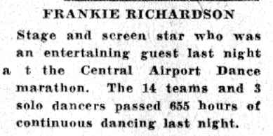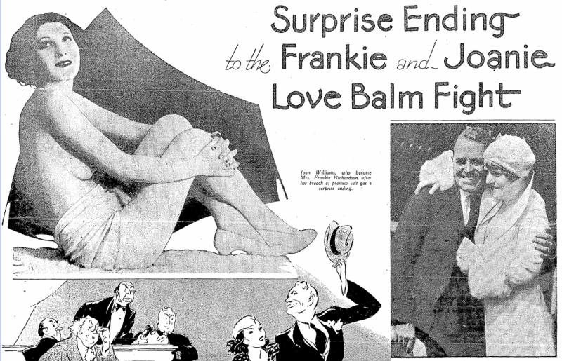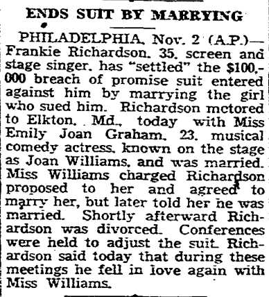 and Joanie were lovers. But instead of the violent manner in which the heroine of the time-honored song wanted to square things with her man, the modern lady wanted cold $100,000 in cash to help heal her broken heart. The lawyer obediently filed the necessary papers; the judge had the accused gentleman arrested on a capias and released on bail; and the scene was set for one of those sensational and theatrical breach of promise suits in which the attractive female of the species usually triumphs over a lugubrious swain by weeping tears of outraged innocence on the witness chair. But sometimes truth is stranger than fiction, and this time the applecart of traditional procedure was completely upset in a surprising and unique manner. Joan did not get the $100,000 from Frankie, but she did succeed in winning what was even dearer to her heart, the got the man himself. For the distasteful suit was withdrawn and on November 1, Joan Williams, the plaintiff, became Mrs. Frankie Richardson, wife of the defendant, who is a screen, stage, vaudeville and radio entertainer with an amiable personality and the ability to put over a sentimental song which has made his name famous· from New York to Hollywood. The plot of this unusual tale had its inception in January, 1933. At that time Joan Williams, who was christened Emily Joan Graham, and had changed her name for tlage purposes, had come over from New York to Philadelphia to visit her mother, Mrs. Mary Graham. Joan had been one of Earl Carroll's girls in his "Vanities." She had also been prominent in the choruses of several other musical revues and had appeared at several night clubs. While Joan was staying with her mother. she also paid a call on her theatrical agent, who wanted to book her at one of Philadelphia roof cafes. Joan consented and told him that she had to return to New York for a few days. The gentleman proposed that if she wanted company on the trip she might make the two-hour journey with Frankie Richardson, a good friend of his. Joan said, "Swell" and she and Frankie thus met for the first time. Now Frankie Richardson is himself a lad who hails from the Quaker city. Born there in 1898. he wanted to go on the stage almost as soon as he could walk and talk. Frankie had the boy soprano voice and plenty of stage presence at the rather carly age of eight. He made a hit and got an engage-ment with Dumont's Minstrels as the "Wonder Boy Tenor". Later he went with Emmet Welch's Minstrels on the Million Dollar Pier in Atlantic City, played with circus shows and graduated to Ihe post of master of ceremonies in vaudeville and moving picture houses, Hollywood wanted him and Frankie Richardson went out there to appear in the Movietone Follies, one of the first all-singing, all-dancing and all-talking cinema revues. He was in "Sunnyside Up" where he shared the limelight with two other Philadelphia-born fa-vorites. Janet Gaynor and EI Brendel, and In "Let's Go Places" and "Happy Days." Then he came back east to vaudeville and was taken right back to the hearts of his public when he sang the song hits from the movies with his typical style of syncopating rhythm. Joan Williams had of course heard of Frankie Richardson. Naturally she was tremendously flattered when, after the two-hour train journey, he asked to see her the next day. Then there followed what Joan described as a whirlwind courtship for three exciting months. Frankie sent me flowers and candy almost every day," Joan said last April. "We went out together all the time. He introduced me to his friends. He came to see me at my mother's home and mama was very fond of him. My agent seemed very happy at the results of his introduction. Everything looked more than rosy. "Then on March 1, 1933 Frankie proposed marriage to me. I accepted because I loved him and I believed that he loved me. The date of the wedding was set, it was to take place in the summer. I began to collect a trousseau. "Then without any warning or any hint from Frankie or any of his friends, on April 16 Frankie told me abruptly but firmly that he could not marry me because he already had a wife. Adele. who was living at his home in Stonehurst near Philadelphia. "You can imagine how I fell. Surprised and embarrassed are not the words. My agent had never mentioned the obstacle of a wife. My mother could not believe that Frankie was the type who would deceive a girl deliberately and in cold blood." However, there was a wife, and Joan Williams lost no time in taking her hurt pride and injured feelings to a lawyer. John R. K. Scott, who filed a suit for breach of promIse, asking $100,000 as balm. In the legal brief, it was stated that the plaintiff anticipations of a blissful married life with the defendant were shattered when said defendant informed her he was already married and his wile was living, so that it would he impossible for him to keep his agreement." It went on to say that she had suffered great injury to her reputation and social standing; what is more, it informed the court that the plaintiff was willing and ready to marry the defendant, whom she loved. Judge Lewis issued a capias for the accused, requiring Richardson to enter bail so as to ensure his appearance in court at the proper time. Richardson, who was then ap-pearing at a Philadelphia moving picture house as master of ceremonies, complied and then left to fill an engagement in Baltimore. Richardson himself refused to be interviewed. His "fiancee" however. was not so reticent. She was anxious to relieve her troubled heart by spilling her story to whoever would listen. "Frankie's first song hit was 'What Is the Use to Remember When the Girl You Remember Forgets" were her words. "Well, I sing it all day now except that I substitute boy for girl. Only a few days ago Frankie and I both loved another one of his hits. 'Hurry Up Those Wedding Bells,' but I guess he thinks I'll forget that, too. "The one I liked best was 'I'm in the Market for You' and I still sing it 